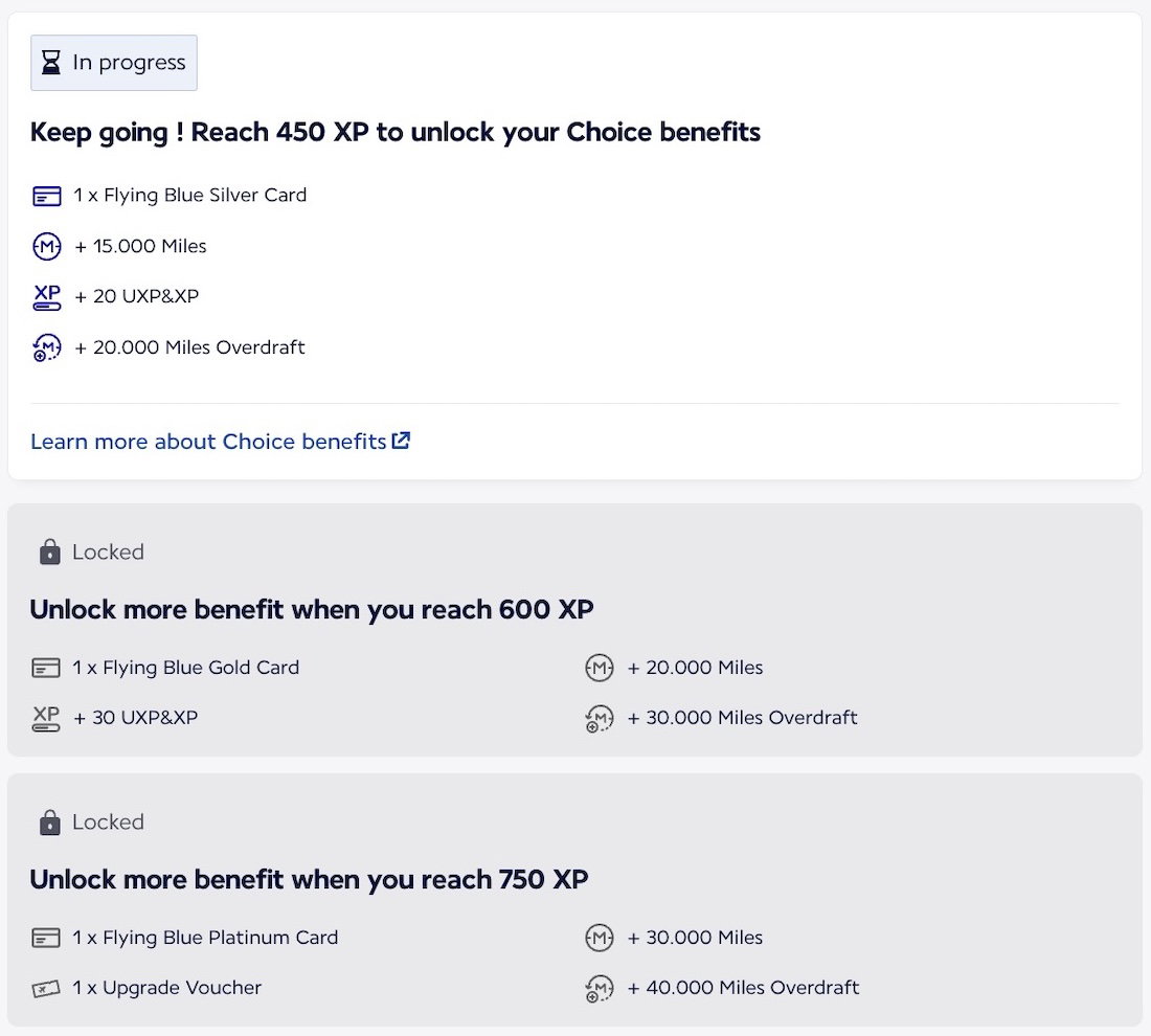 - When members unlock 450 UXPs, they can choose 15,000 bonus miles, 20 bonus XP/UXPs, a gift of Flying Blue Silver for someone else, or an overdraft of 20,000 miles