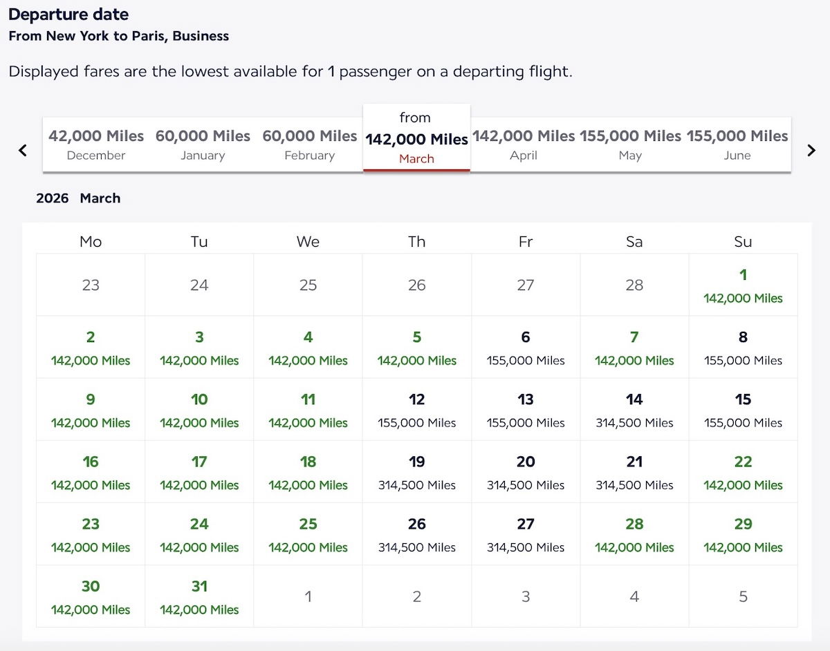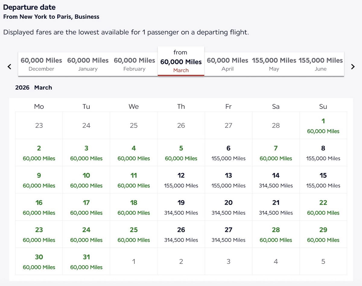 As an example, take a look at a search for business class awards from New York to Paris in March 2026, using the hidden calendar feature. When I’m logged into my Flying Blue Platinum account, I see 20 dates with the lowest award pricing, of just 60,000 miles per seat.
