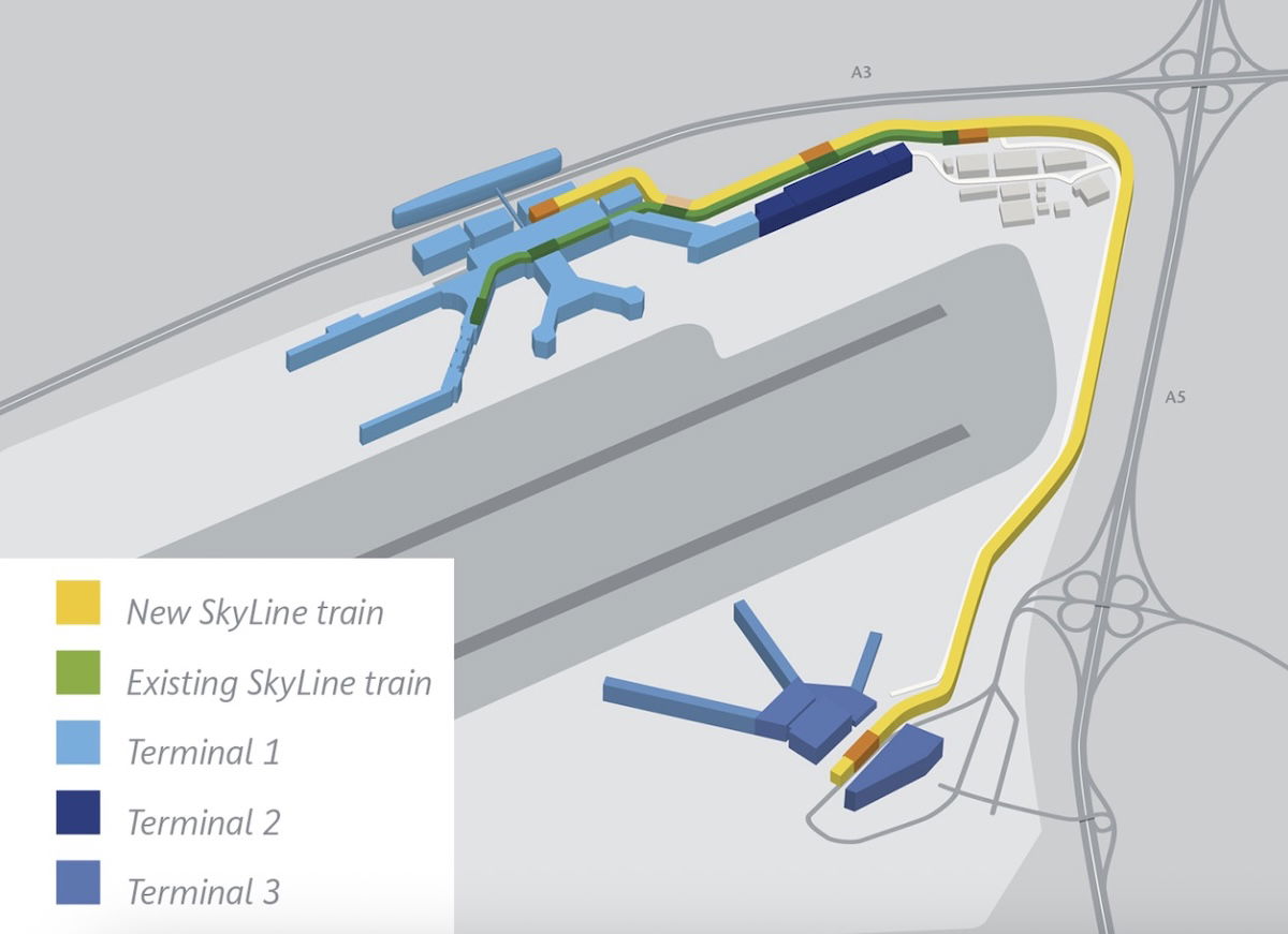 Terminal 3 is located on the complete opposite end of the “field” of Terminal 1 and Terminal 2 (across all the parallel runways), though there will still be a SkyLine connection between terminals, operating every two minutes, with a journey time of up to 10 minutes.