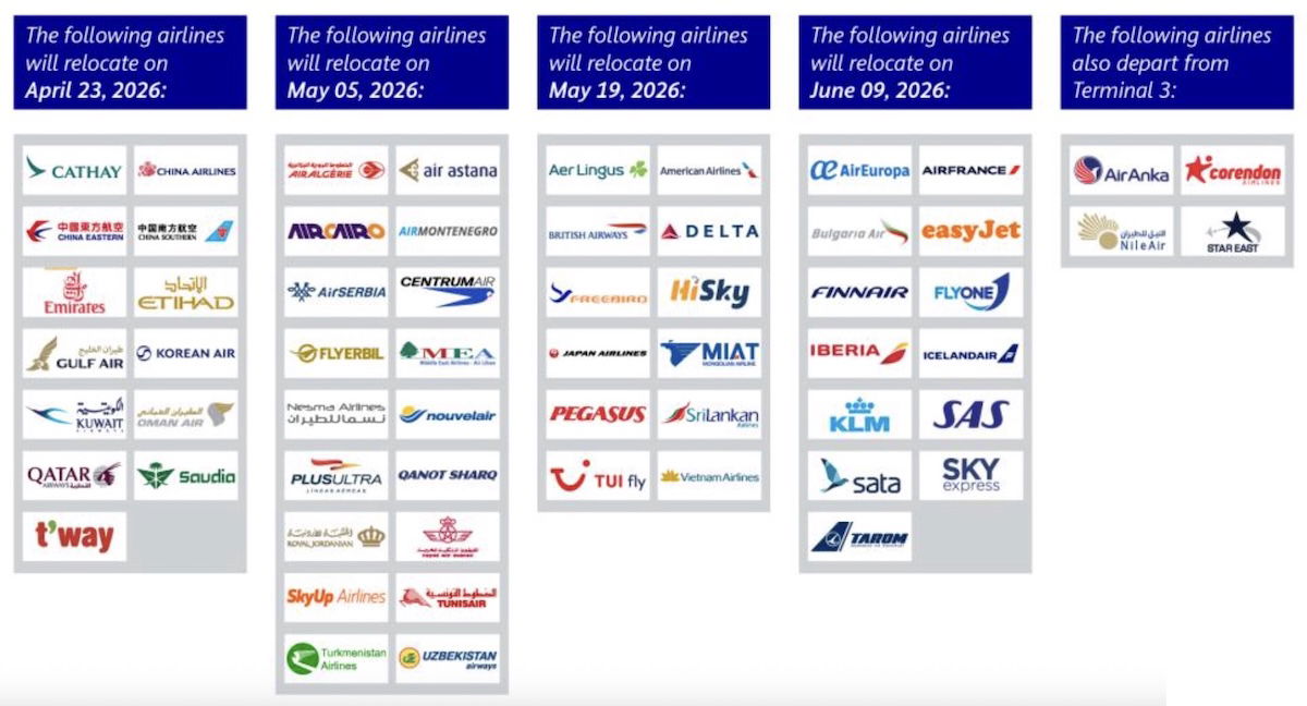 Anyway, there are now firm dates for the move from Terminal 2 to Terminal 3. Airlines are expected to transition to Terminal 3 on four sets of dates, starting on April 23, and ending on June 9, 2026.