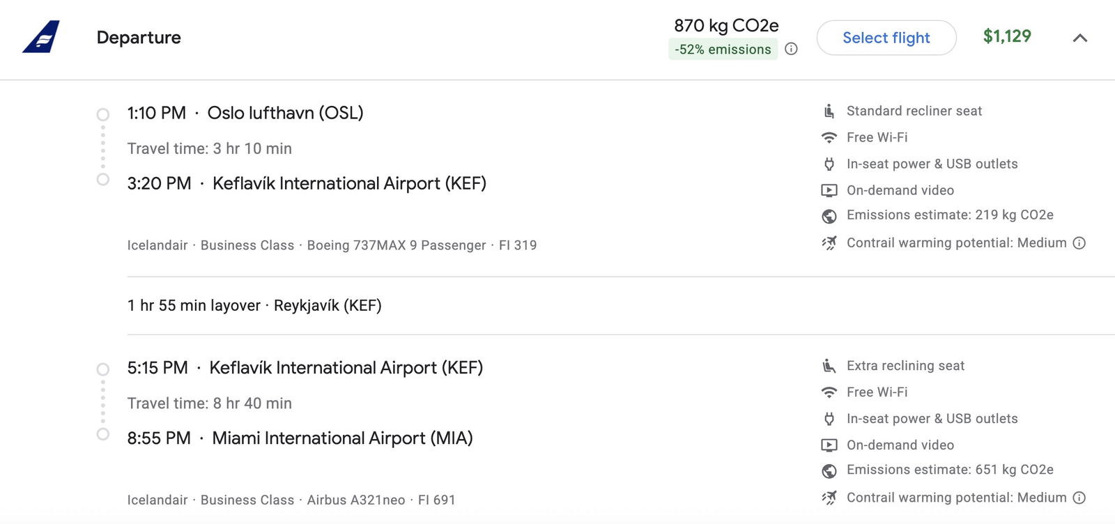 FI690 Miami to Keflavik departing 6:15PM arriving 5:55AM (+1 day)