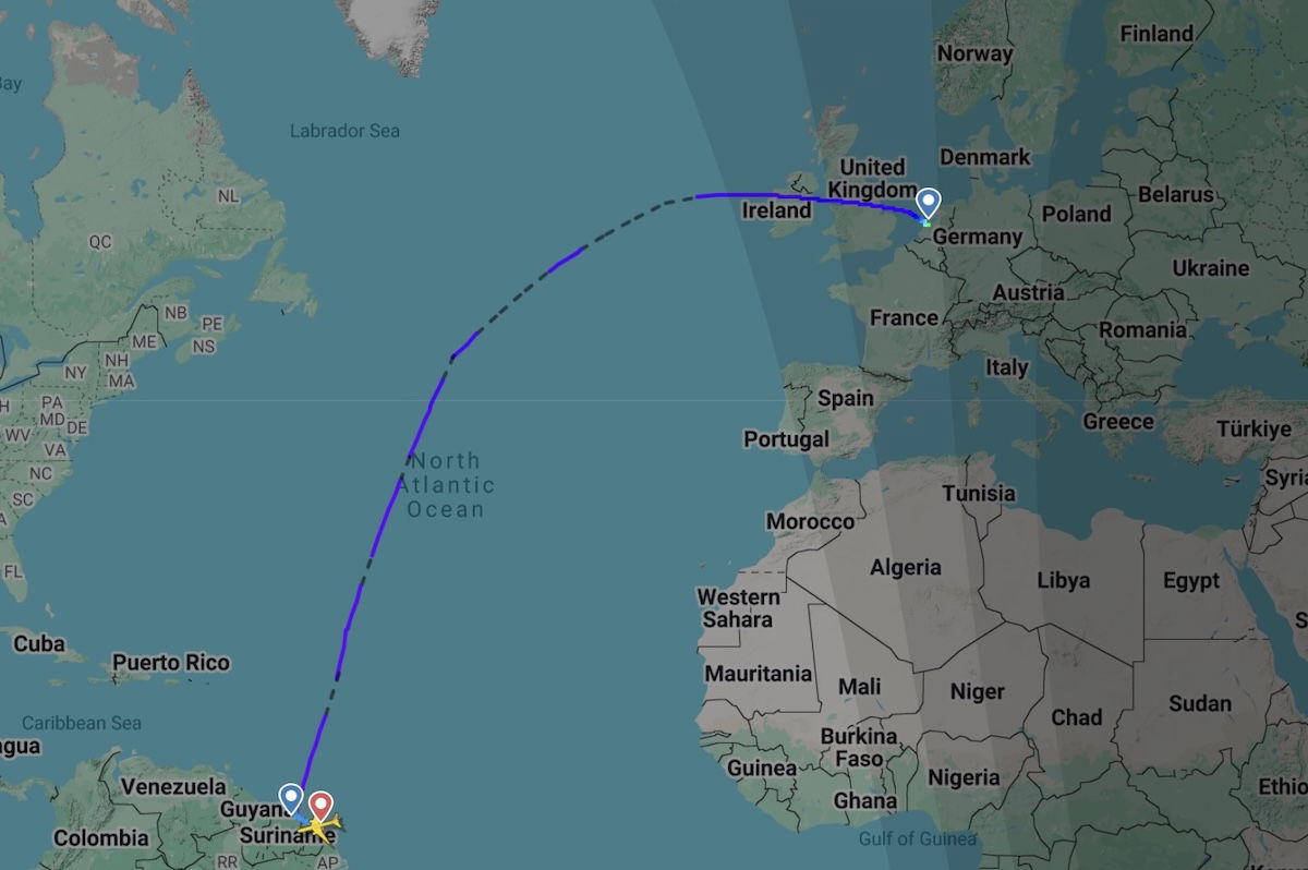 After holding for around 25 minutes without any developments, the crew decided to divert to Cayenne, French Guyana (CAY), located 199 miles away. The plane landed there at 2:40PM local time, 9hr34min after it first departed from Amsterdam, and around an hour after discontinuing the approach to Paramaribo.