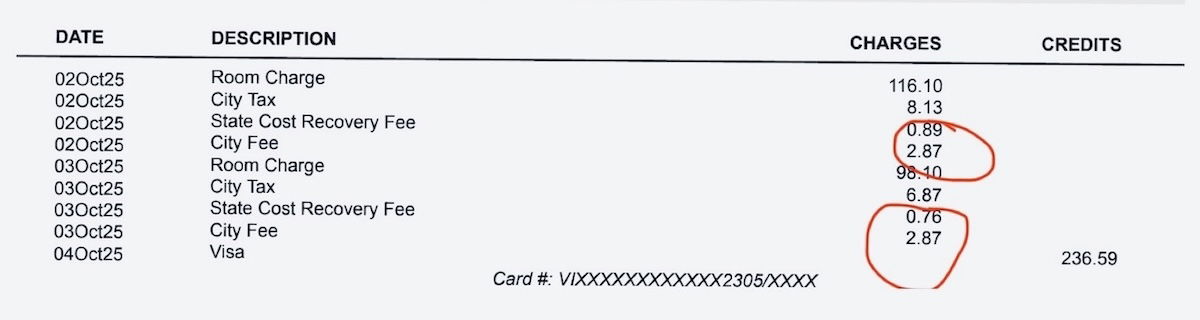 However, at check-out, she noticed a $2.87 per night “City Fee” on the folio, as it was described. Note that she works for the state of Texas, so she’s tax exempt, and also pays attention to the details on folios.