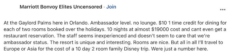View from the Wing flags an interesting post in the Marriott Bonvoy Elites Uncensored Facebook group. A Bonvoy Ambassador member (Marriott’s highest elite tier, with a $23,000 annual spending requirement) shares the disappointing elite recognition he received while staying at the Garylord Palms property in Orlando, while spending $19,000 for 10 nights across two rooms: