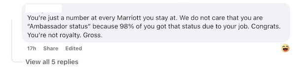 Perhaps what surprises me most is the brashness of literally posting this publicly, using your real name, while essentially identifying as a Marriott employee (by using the term “we”). Like, this is beyond disrespectful in any line of work, especially when speaking about one of your best customers.