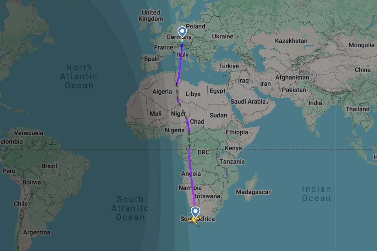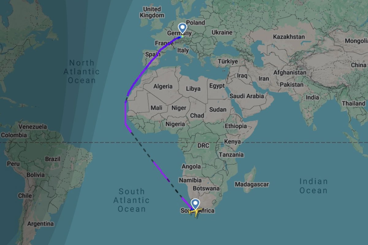 A Lufthansa Airbus A350 flying from Munich to Cape Town had a much longer than usual flight. Rather than flying directly south over the continent, the jet instead flew almost the entire way over the Atlantic Ocean, avoiding land.