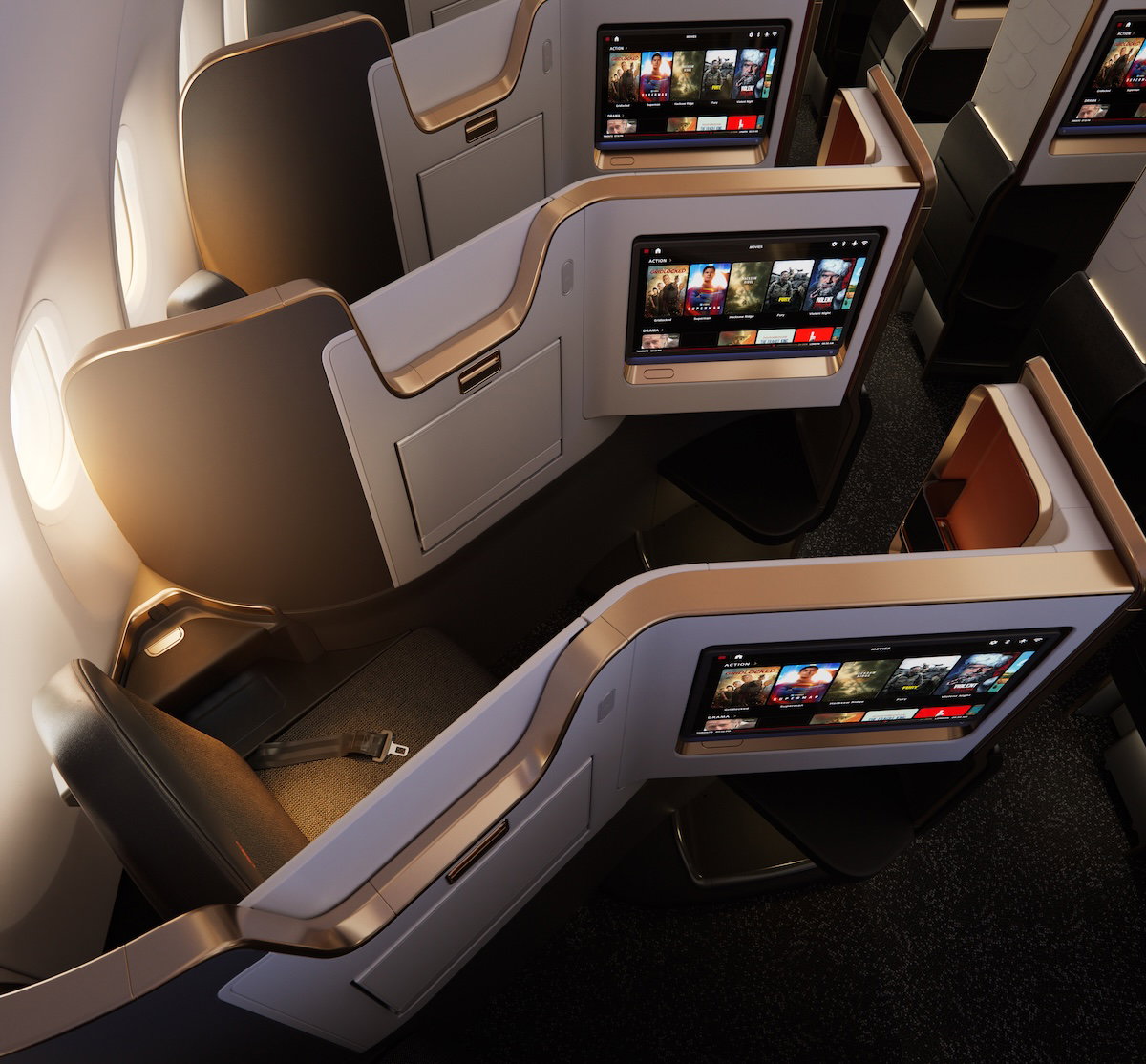 These are reverse herringbone seats with doors, and as you’d expect, tech is greatly improved, with 27″ 4K OLED monitors and bluetooth audio, along with AC, USB-C, and AC power outlets.