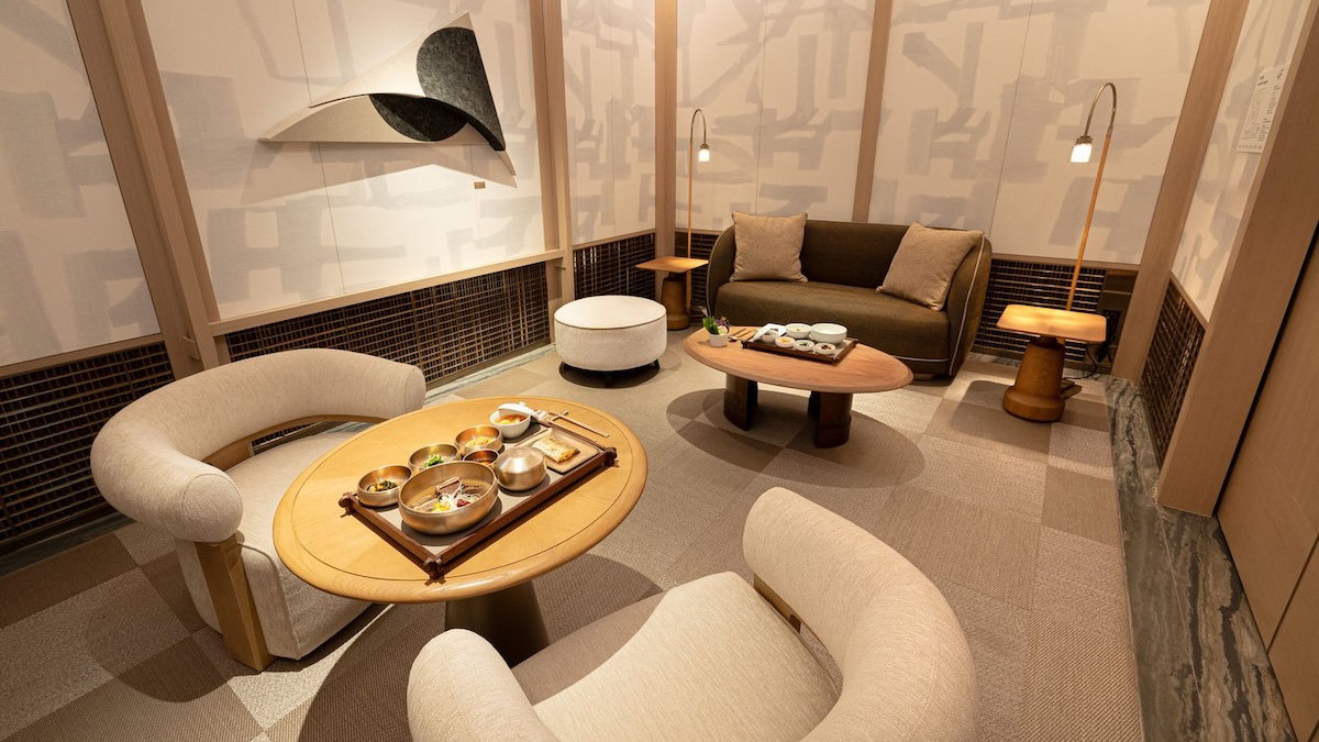 As it’s described, the interior draws inspiration from traditional Korean architecture, utilizing wood pillars, beams, and ramie (mosi) textures. Key features of the new lounge include: