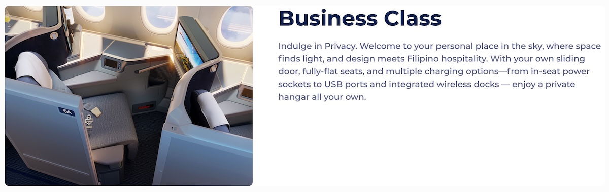 In business class, Philippine Airlines has 42 seats, in a 1-2-1 configuration. Specifically, the airline has selected the popular reverse herringbone Collins Aerospace Super Diamond seat with a door. This is virtually identical to what you’ll find on Etihad’s A350-1000s. Seats have 42″ of pitch, 20.25″ of width, and have AC, USB-A, USB-C, and wireless charging, along with free Wi-Fi.