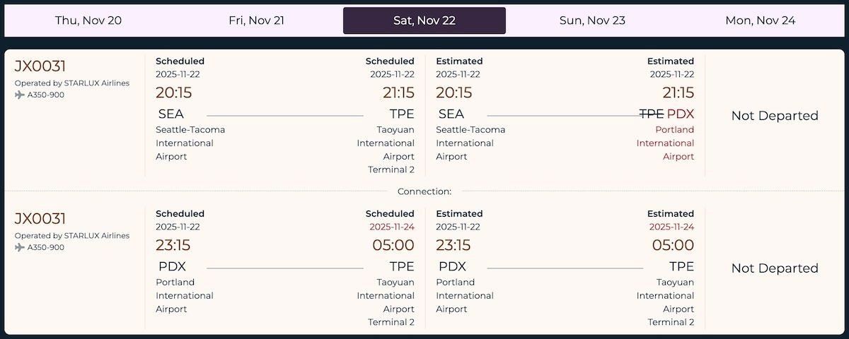 However, we’re starting to see our first flights impacted, on some of the airport’s longest routes (thanks to readers Ian and Nicholas for flagging this). Specifically, Taiwanese carriers EVA Air and Starlux Airlines have both added refueling stops to their Taipei (TPE) service out of Seattle. EVA Air is operating via Anchorage (ANC), while Starlux is operating via Portland (PDX).