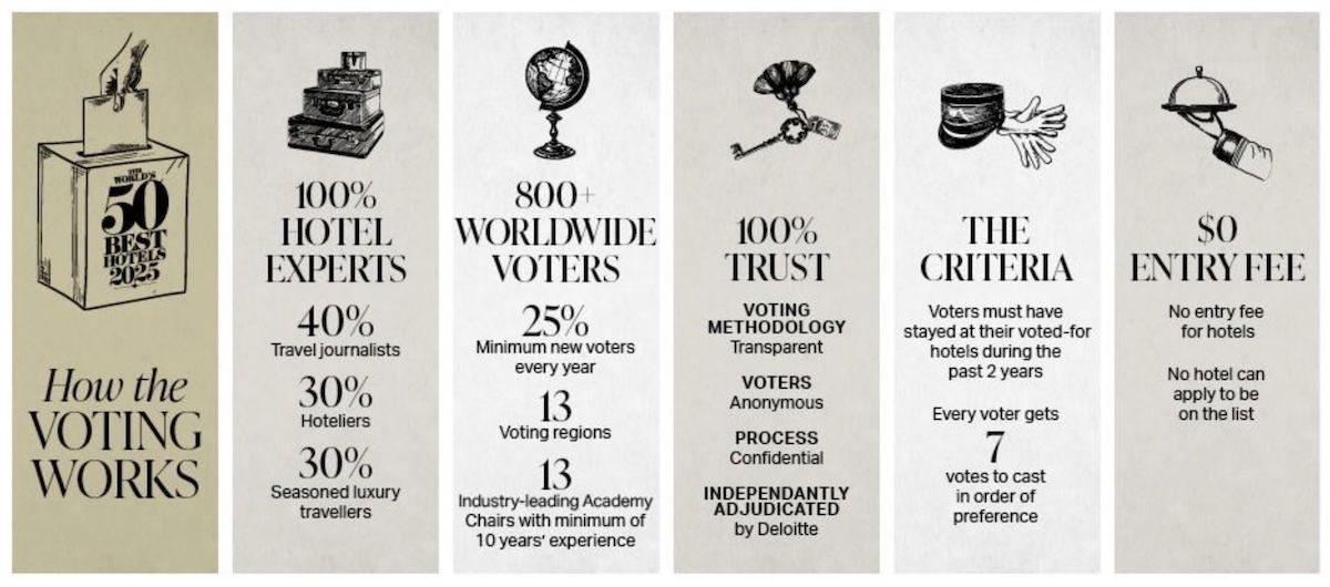 Each member has seven votes, and needs to list the top seven hotels they have stayed at in the past two years, in order of preference. They must have spent at least one night at each property, and press trips, complimentary room nights, and those achieved through loyalty schemes, are valid for consideration. Each voter can only list up to three hotels within the same hotel group.