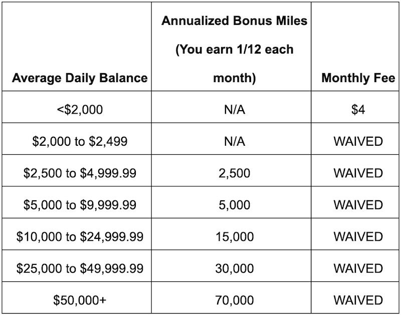 Another unique aspect of the card is that it offers bonus miles for saving. You can receive annualized bonus miles (you earn 1/12 each month) based on your balance. For example, if you keep a balance of $50,000+, you can earn 70,000 bonus MileagePlus miles per year. Now, is that the best rate of return, compared to a high interest savings account? No… but it’s better than nothing.