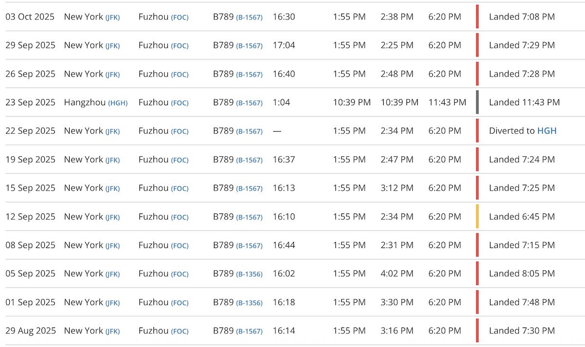 But here’s where it gets interesting — as of the start of the IATA winter season (in late October), the block time for the New York to Fuzhou flight increases drastically, to a staggering 19hr20min. The flight still shows as operating nonstop.