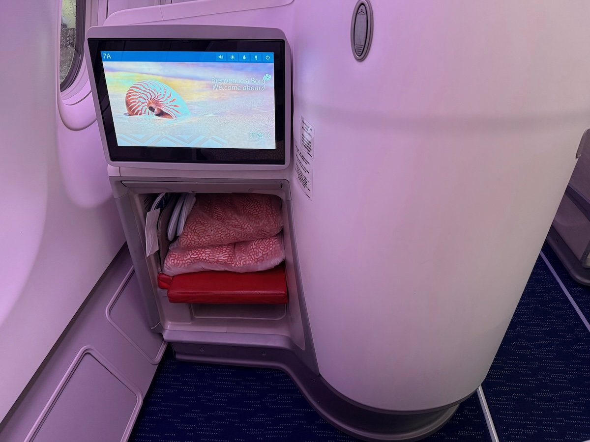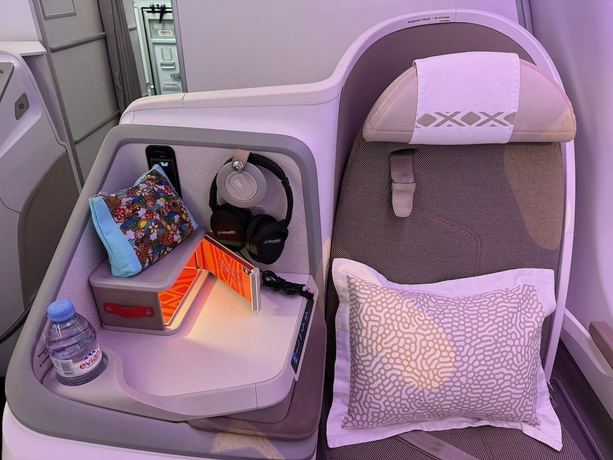 I boarded the flight through the second set of doors, where I was greeted by the friendly crew and pointed left into business class. Aircalin’s A330-900neos boast a total of 26 business class seats, spread across seven rows, in a 1-2-1 configuration.