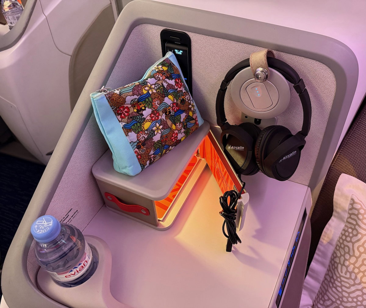 There was a great selection of amenities available in Aircalin business class. For one, there was cozy and colorful bedding, including a plush pillow, a substantial duvet, and a mattress pad.