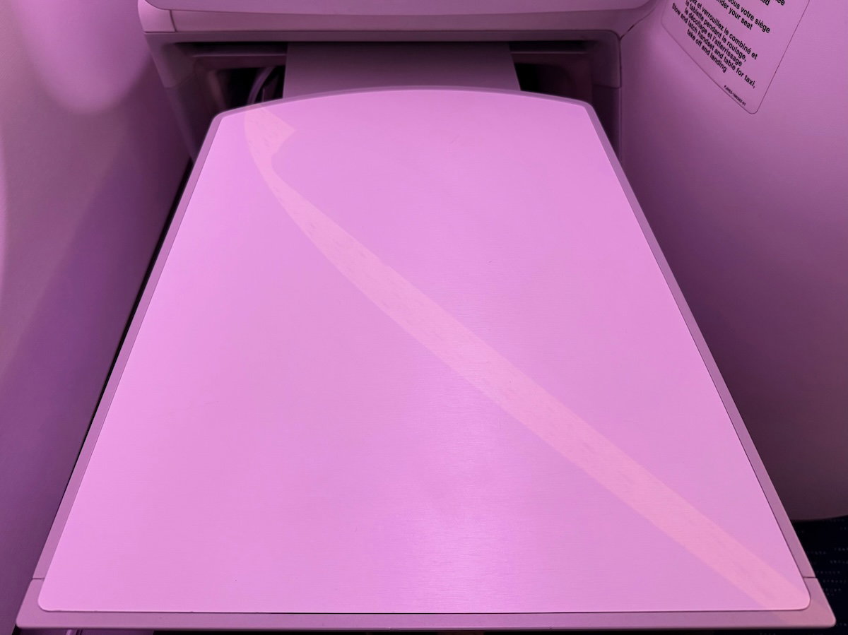 With these seats, the tray table extends from underneath the entertainment screen, and it’s a very long table. On the plus side, it’s pretty sturdy, and it’s easy enough to push forward, in case you need to get up during the meal service.