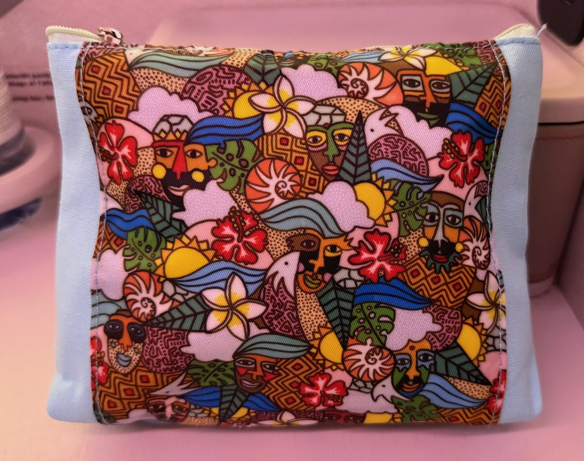 Also waiting at the seat was a colorful amenity kit designed by a local artist.