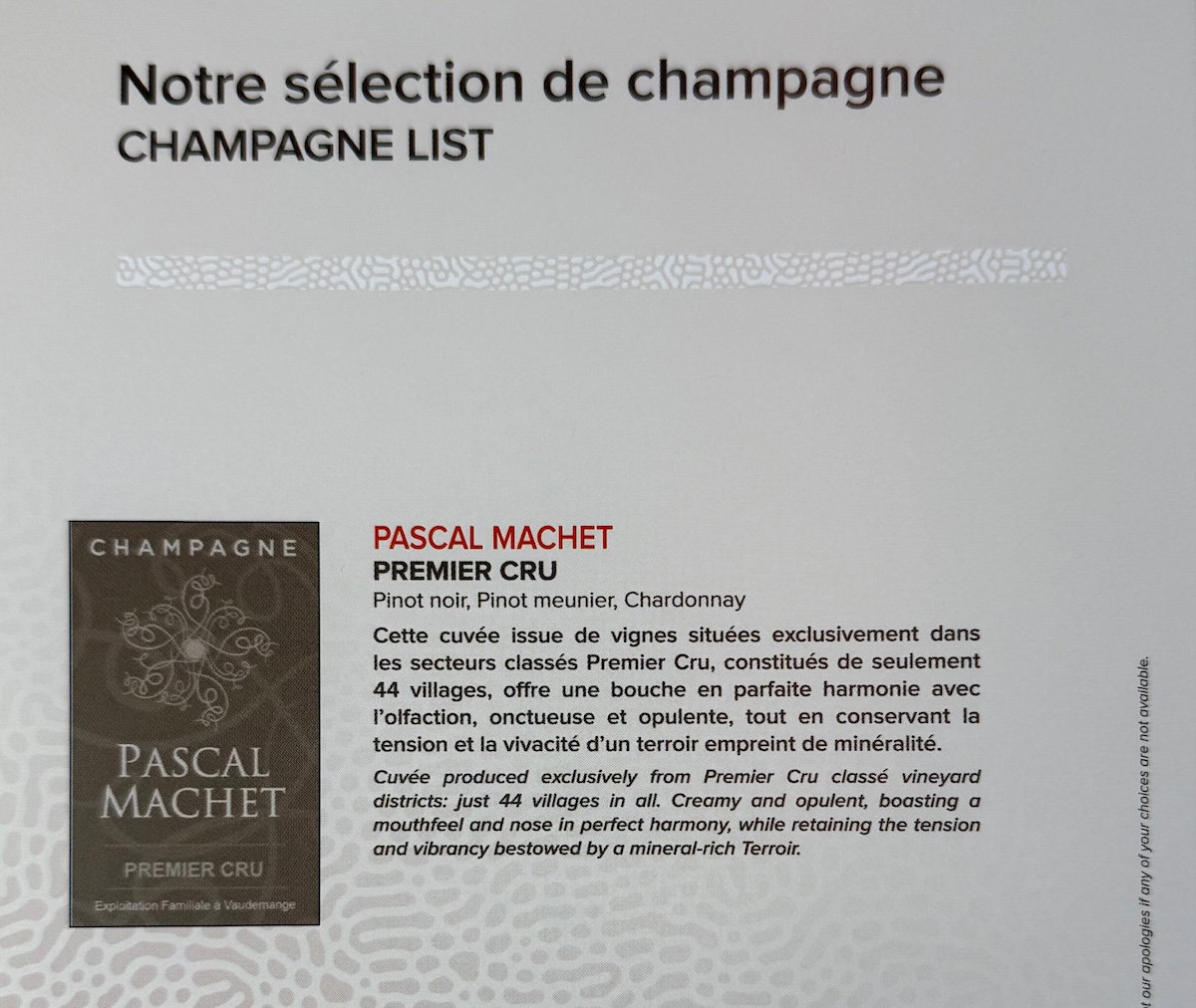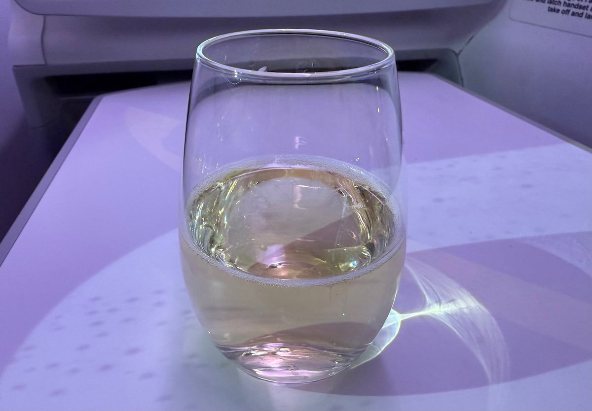 During boarding, the crew came around with pre-departure drinks, with the choice of champagne, a signature kir royale cocktail, or water. I chose the champagne.