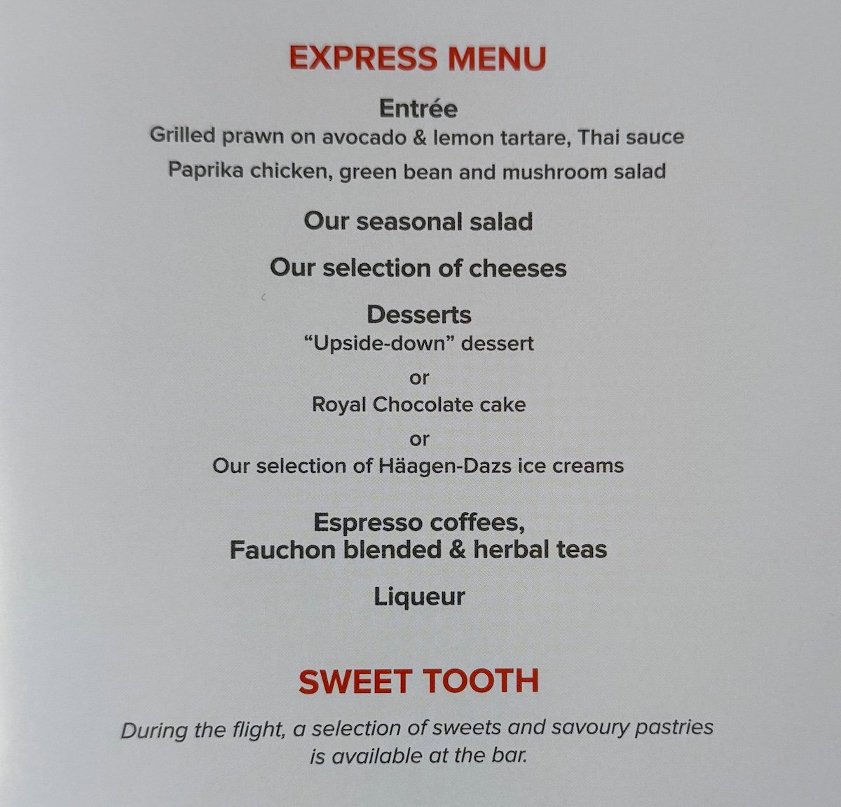 Just as an example, during the meal service, I was never offered a proactive drink refill, even when my glass was empty. But as soon as I asked, they provided it without issue, so it’s not like they had an attitude about it, or anything.