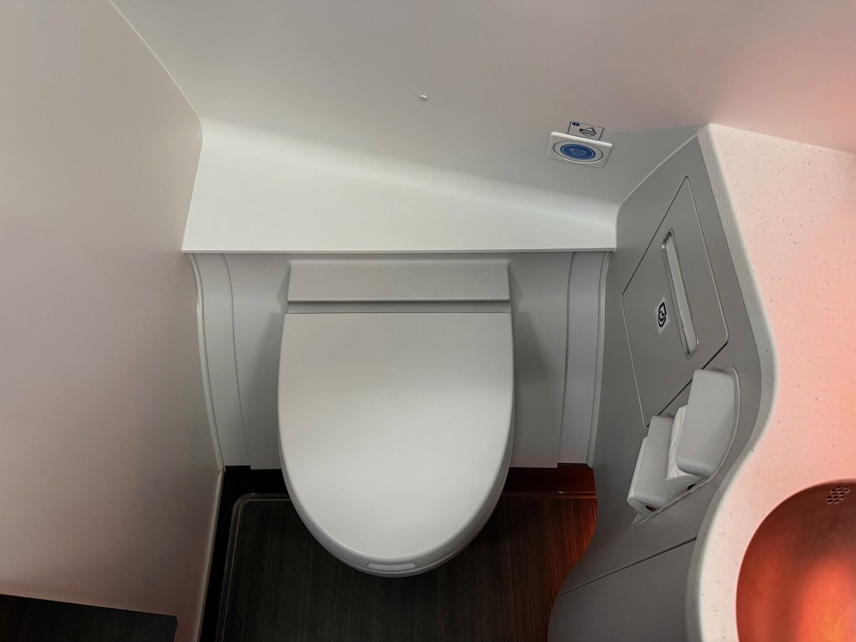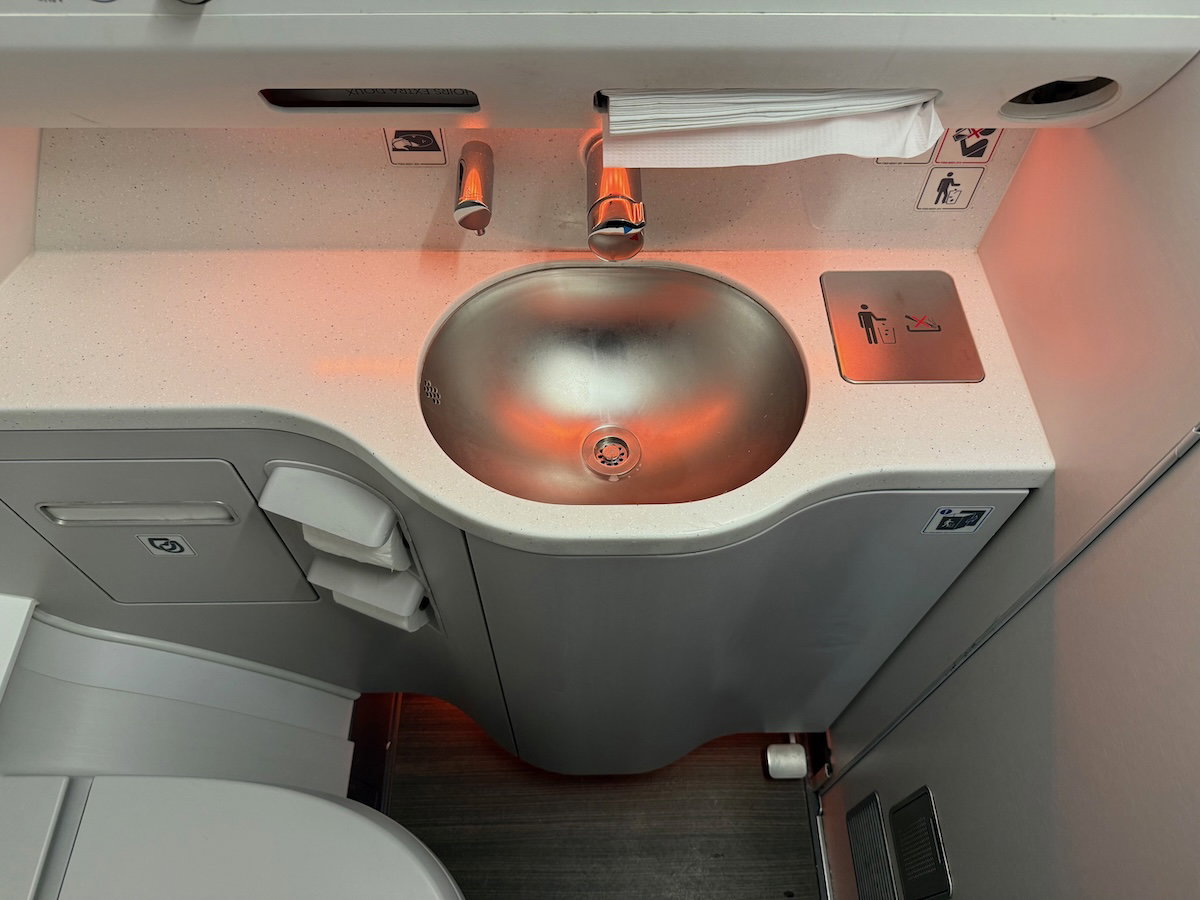 After the meal, I checked out the business class lavatory on the Aircalin A330-900neo. There’s one primary business class lavatory in front of the cabin, by the flight deck. The lavatory was pretty basic, and had nothing in the way of special amenities, and also wasn’t kept terribly clean during the flight.