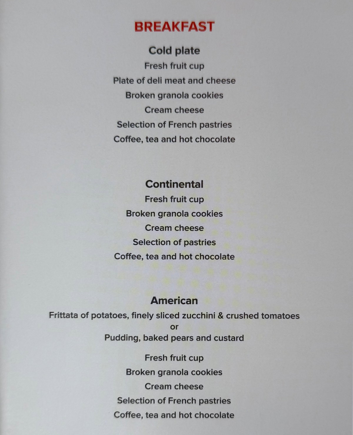 A little under two hours before arrival, the crew turned on the lights in the cabin, and got started with the breakfast service. You can find the breakfast menu below.
