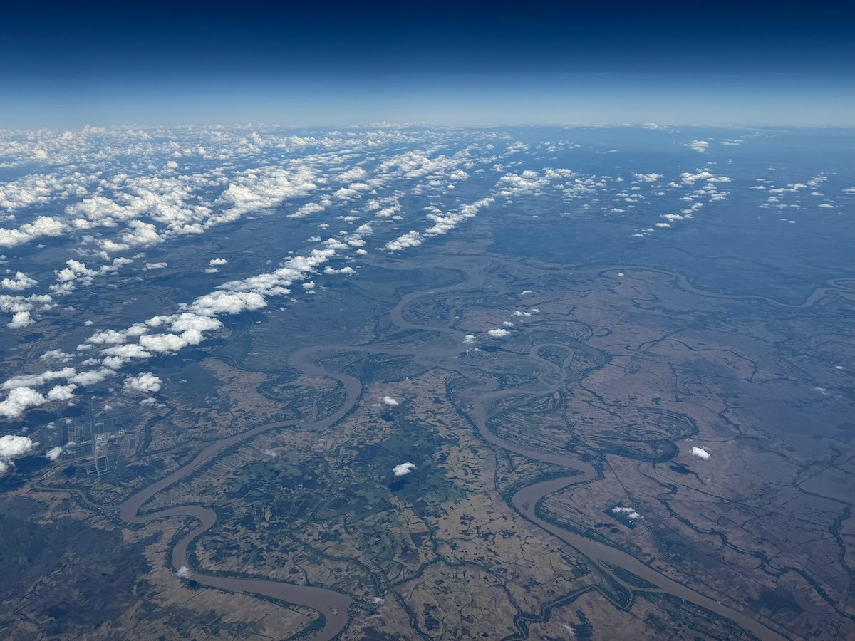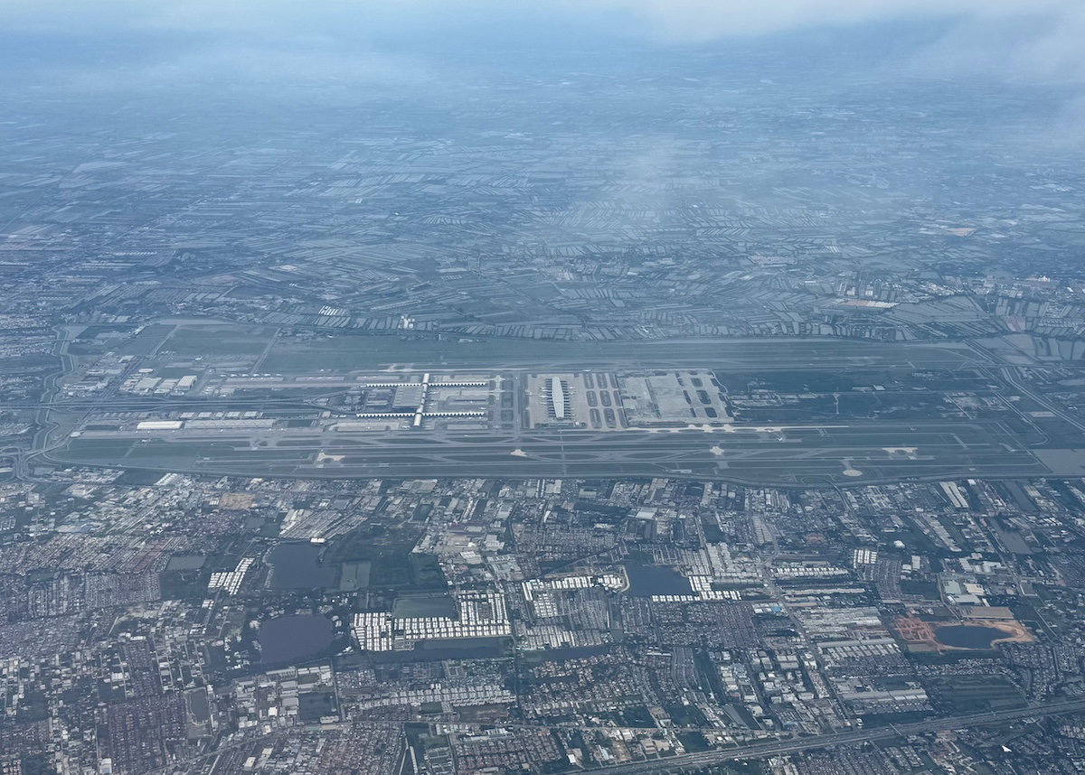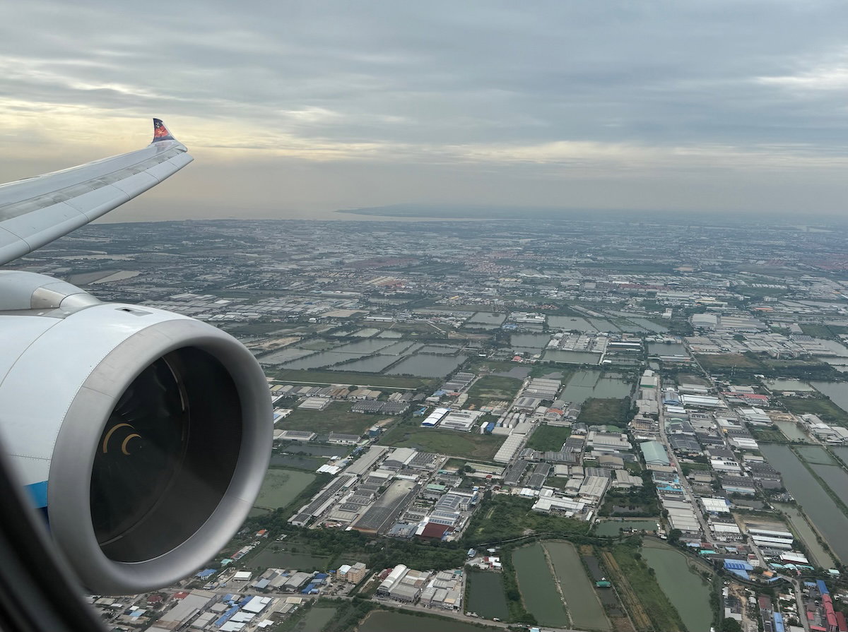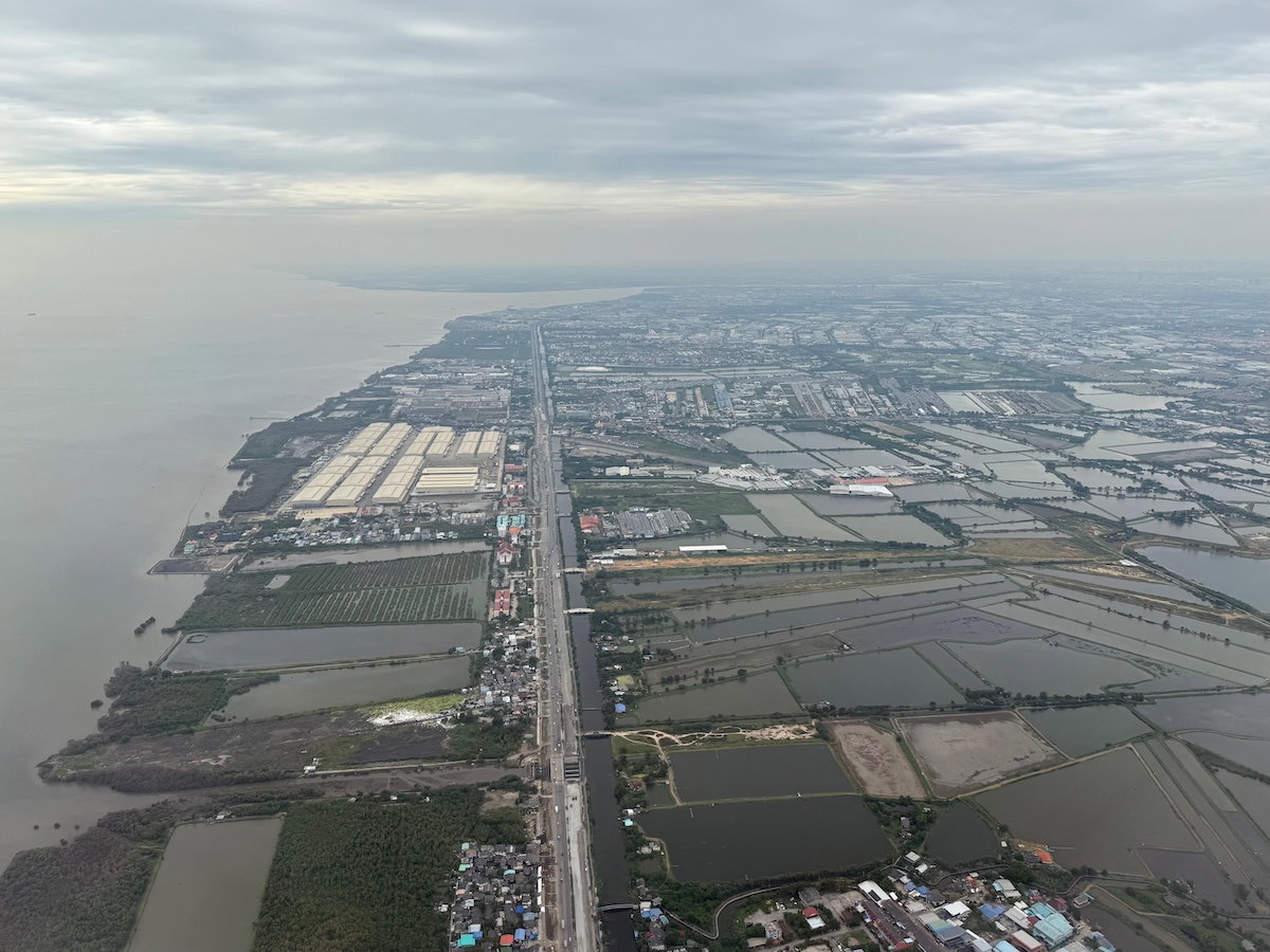 At around 2PM Bangkok time, the captain announced that we’d soon be descending. The seatbelt sign was turned on around 2:25PM, as we were well into our descent. Our approach to Bangkok had us flying past Suvarnabhumi Airport to the south, prior to turning back to land into the north.