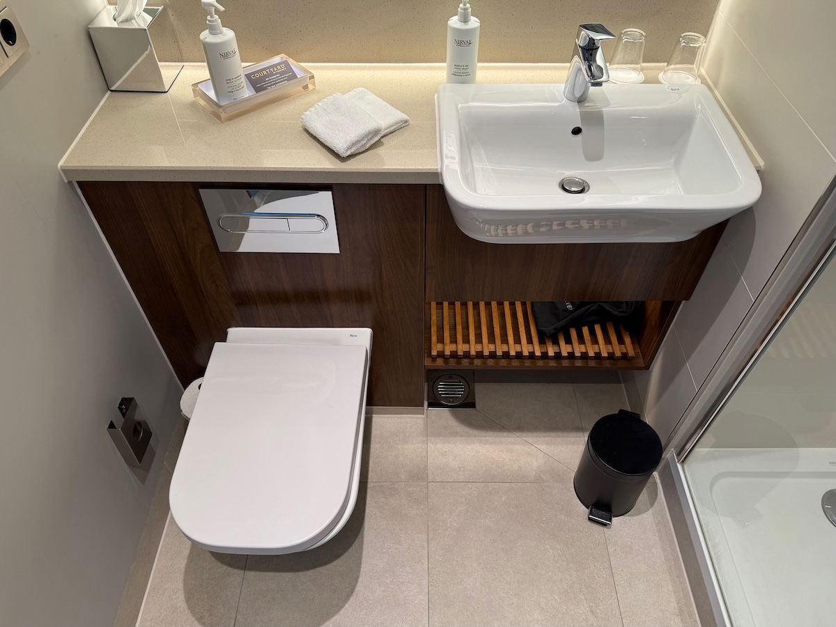 The bathroom was back toward the entrance, and was also compact. It had a sink, a toilet, and a walk-in shower with a half glass shield (which is always such a dumb design, since it causes water to splash into the rest of the room).