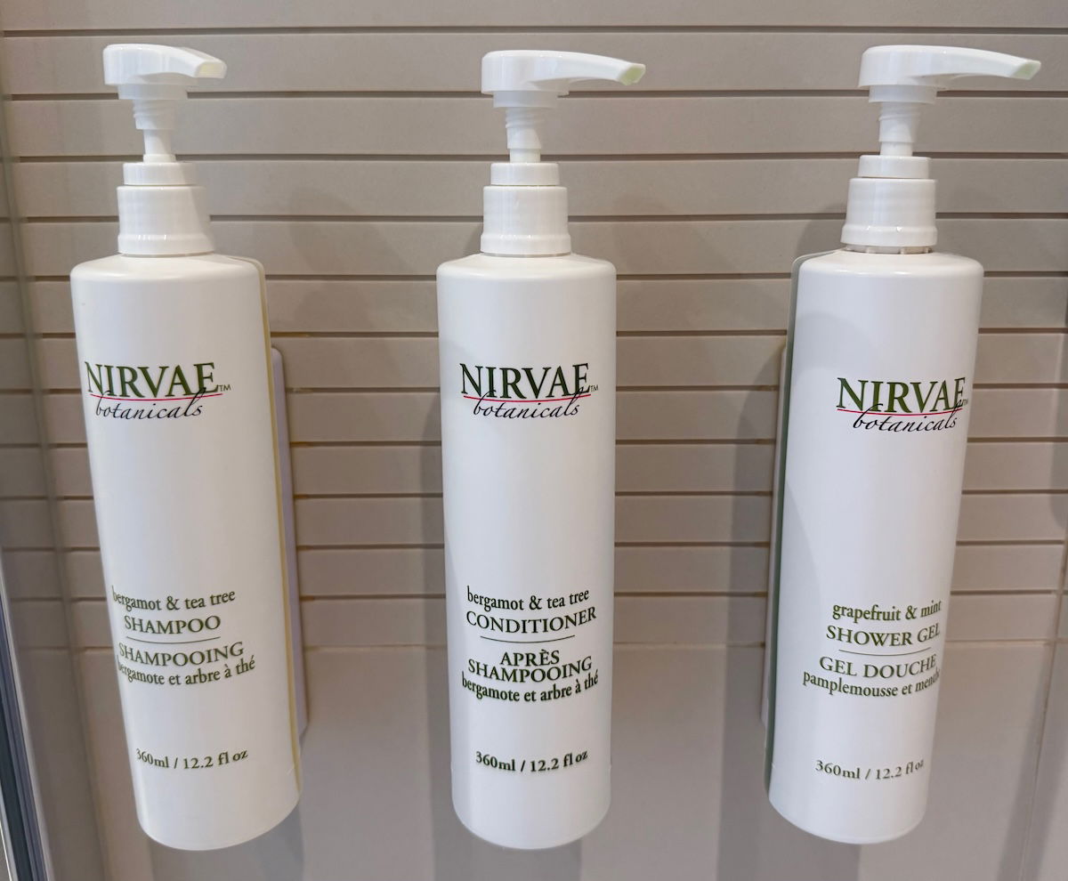 Toiletries were in reusable, wall-mounted containers, from NIRVAE.