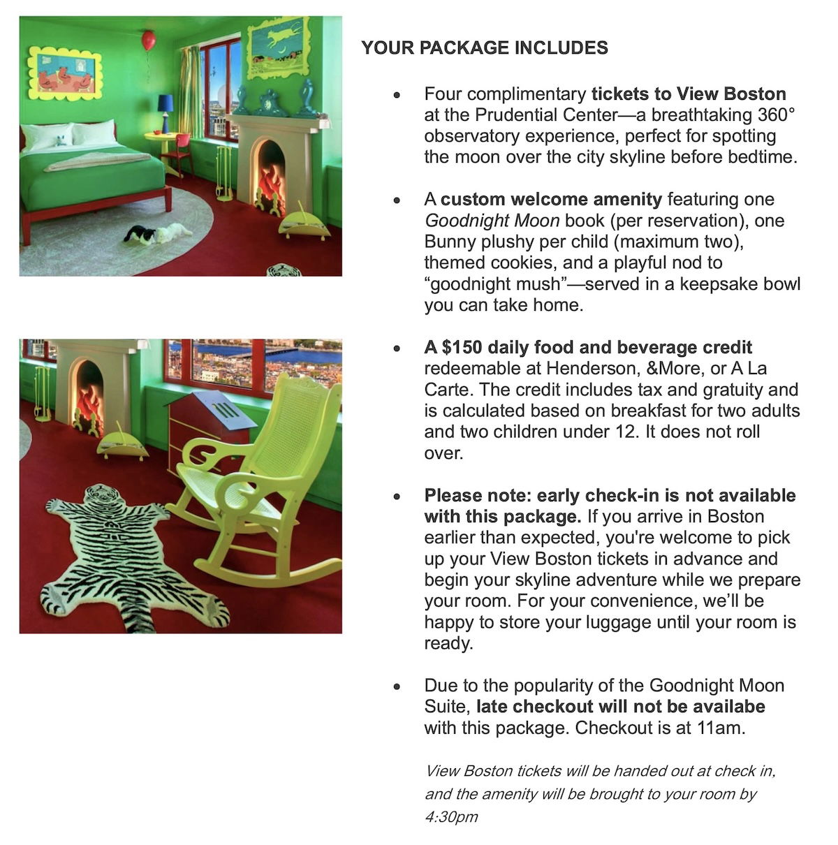 The rate also includes lots of things, like four tickets to View Boston, a welcome amenity (a Goodnight Moon book, a plush bunny, themed cookies, and “mush”), plus a $150 food and beverage credit. Below are some of the details from the welcome letter that I received.