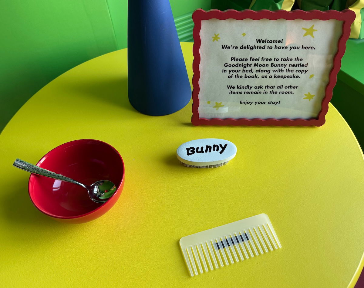 Guests who stay in the suite can take home a copy of the Goodnight Moon book, plus the bunny in the bed, which Miles now sleeps with every night at home.