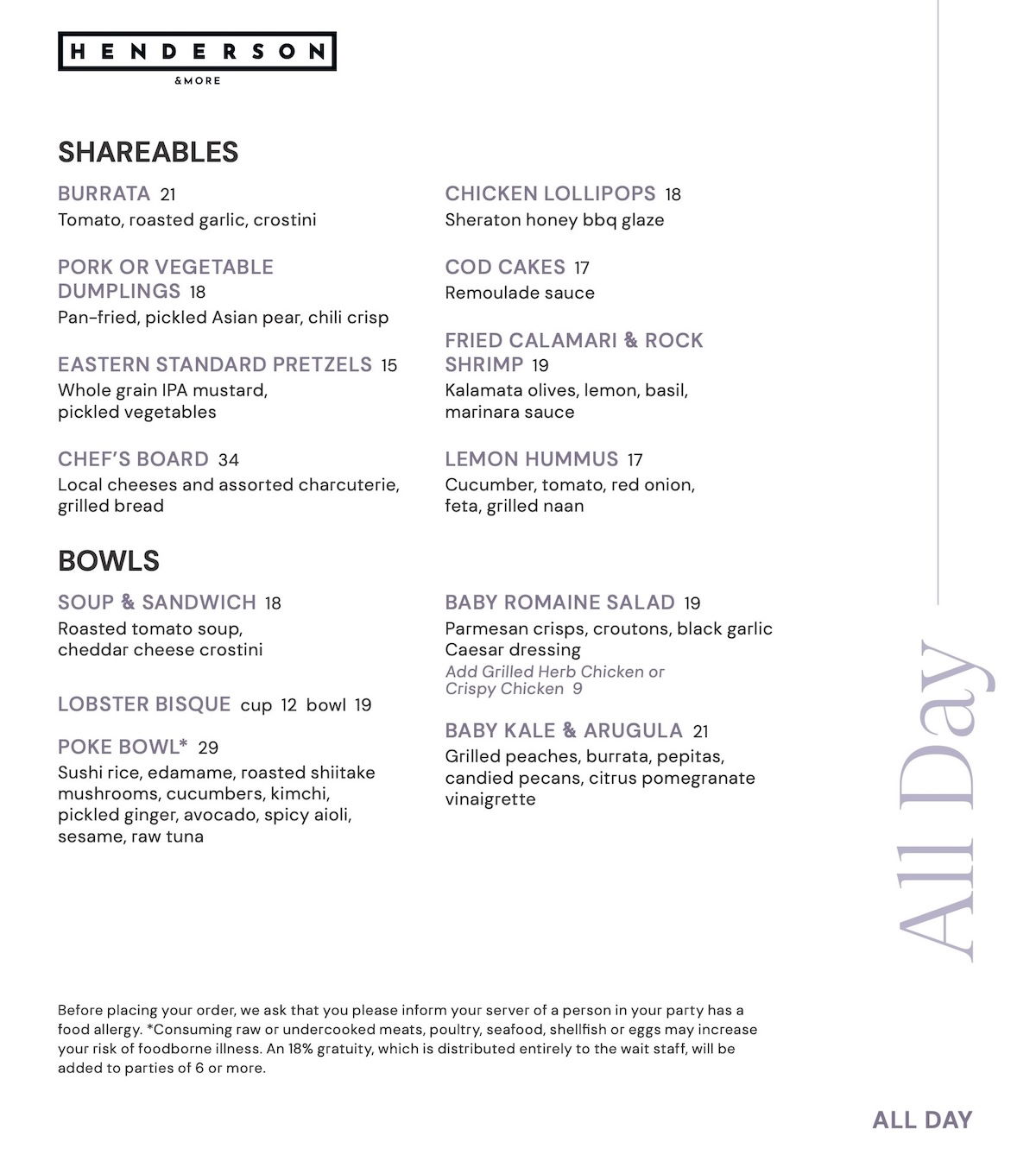Henderson at Sheraton is the name of the “restaurant,” and it’s open daily from 6:30AM until 12AM, and serves everything from drinks, to breakfast, to lunch, to dinner, to snacks. There’s even a grab & go area.