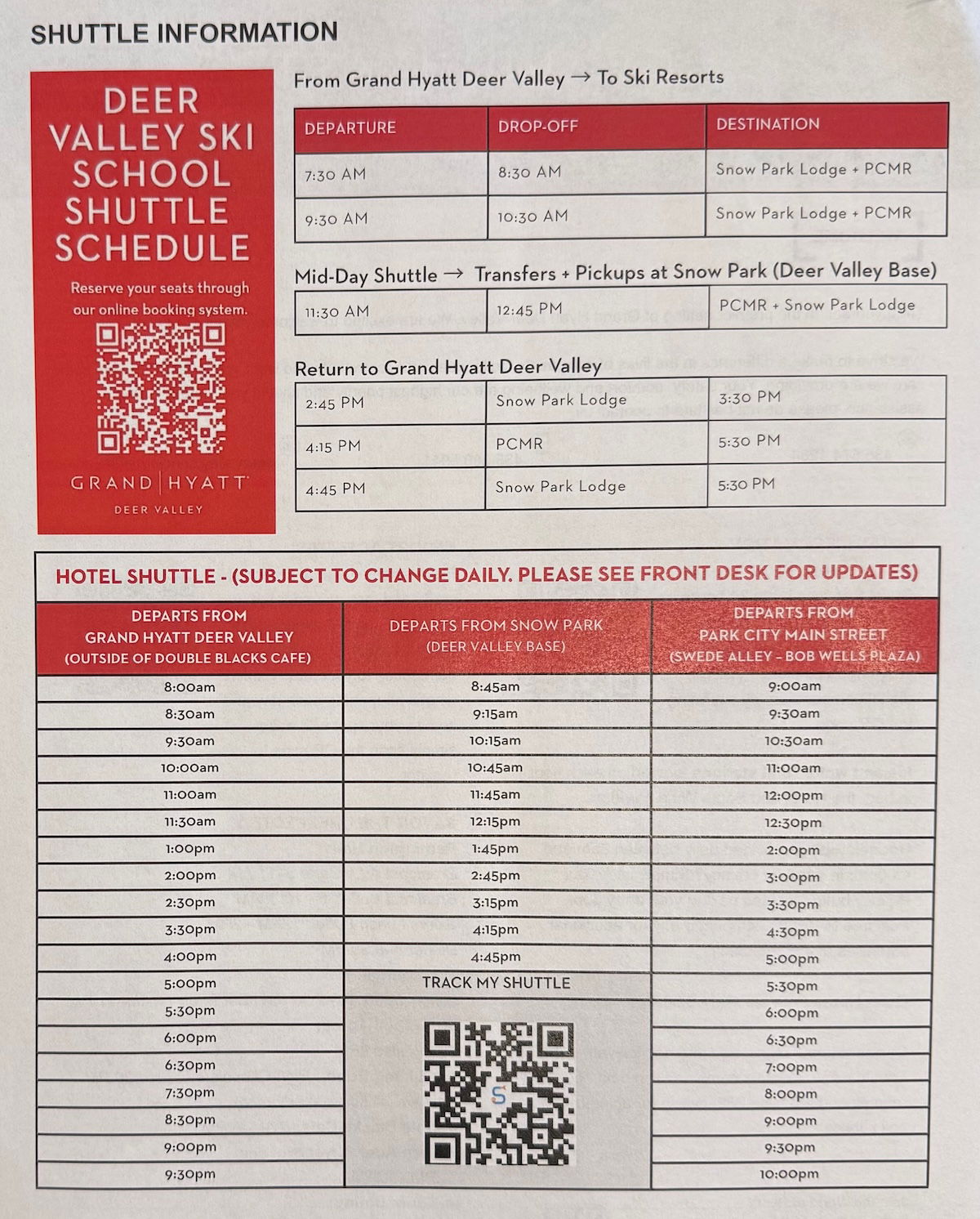 The Grand Hyatt does offer a complimentary shuttle service to both Snow Park Lodge and Park City, and you can find the schedule below.