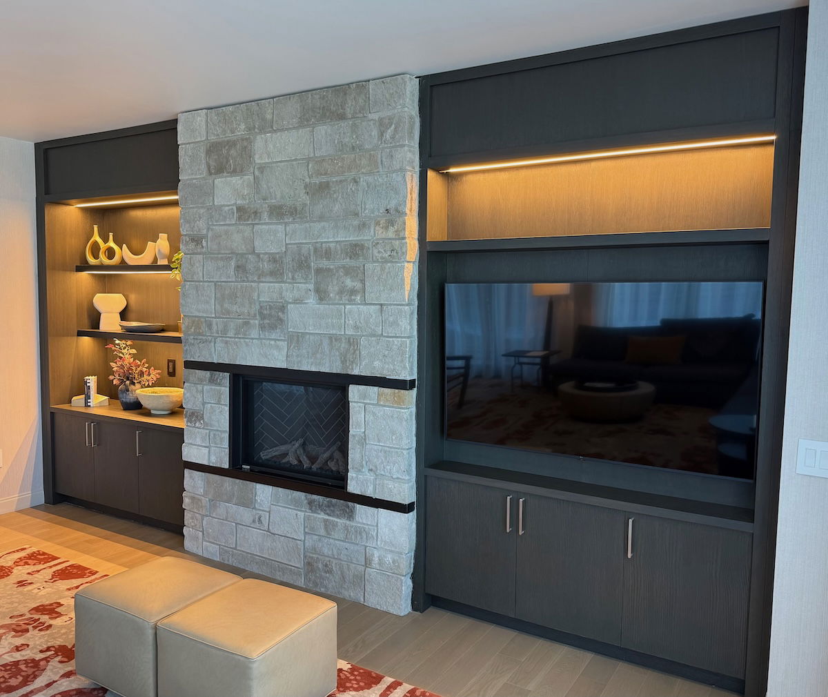 The living area had a huge L-shaped couch, two chairs, and two stools. There was also a wall-mounted TV, plus a fireplace that could be controlled with a remote.