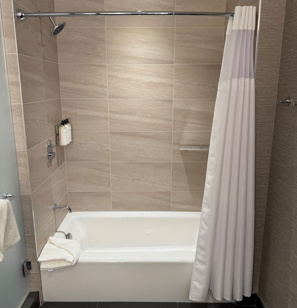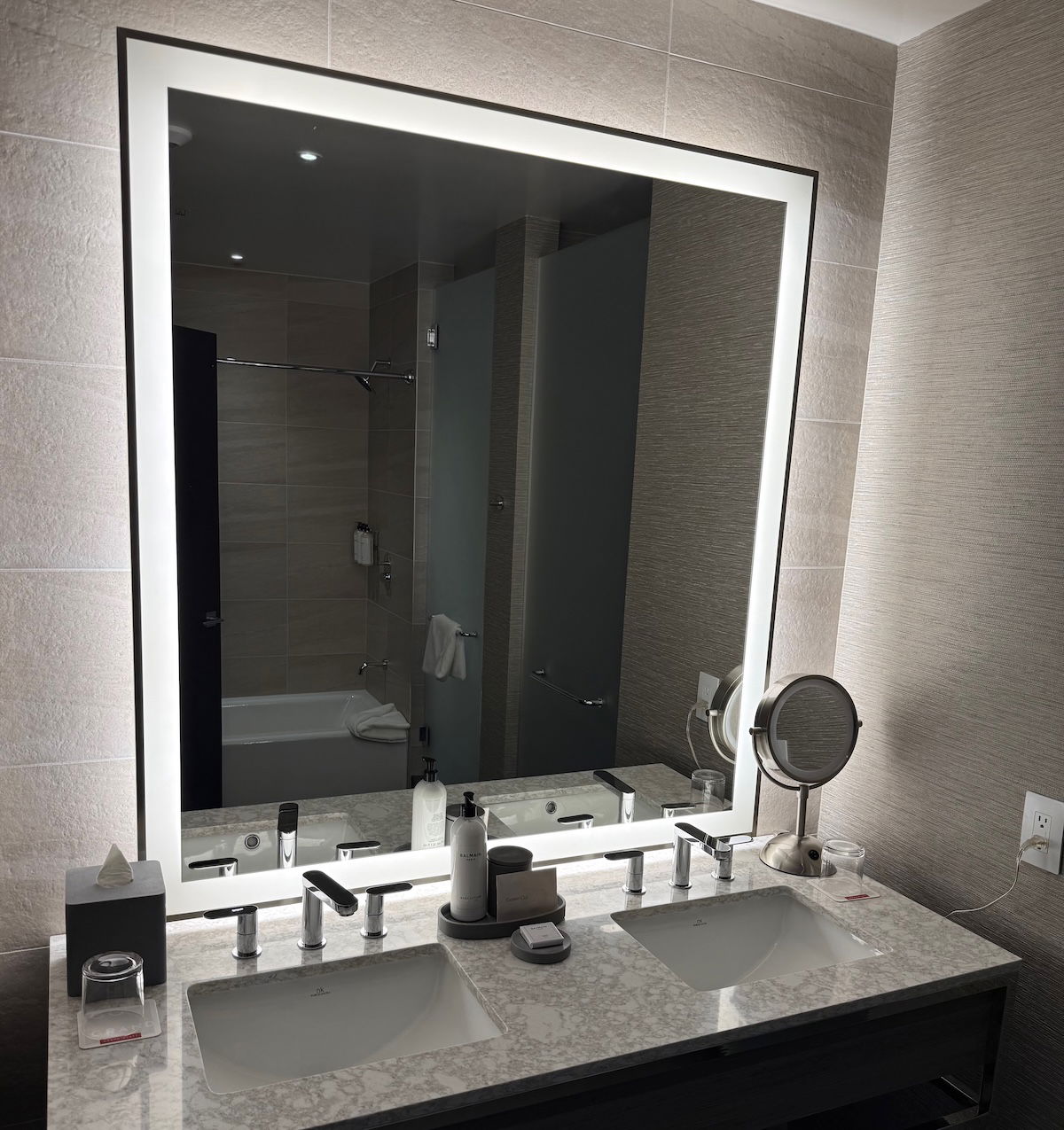Then there was the primary bathroom, which was without the least luxurious feeling part of the room. There were double sinks, a bathtub, a walk-in shower, and a toilet with a door. I don’t want to suggest it was anything terrible, but it definitely felt a little more basic than the rest of the room.