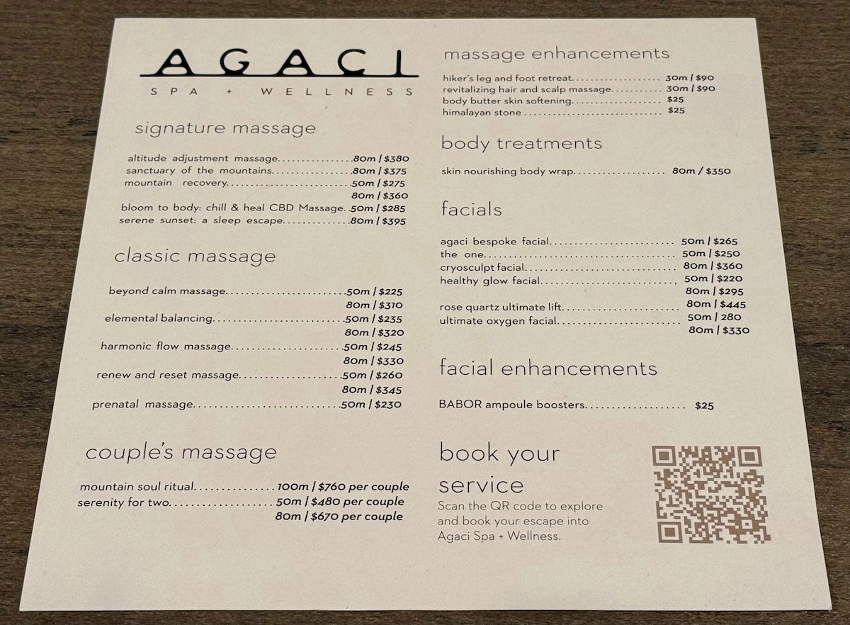 The Grand Hyatt Deer Valley has Agaci Spa + Wellness, which is open daily from 9AM until 6PM. This was a family trip, so I didn’t have a chance to check it out, but you can find the treatment menu below. Spa pricing here is next level, eh? $310-345 for an 80-minute massage, and that’s before tip?! This makes Courchevel look cheap, by comparison!