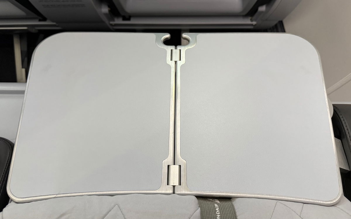 The tray table extends from the side of the seat (the far armrest), and can be folded over in half, and it’s pretty typical for a 737 premium cabin.