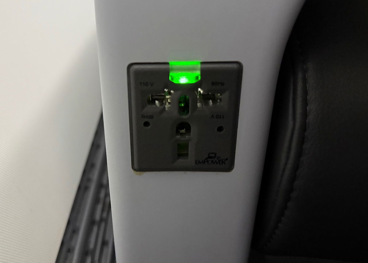 Each seat also has an AC power outlet at the far side of the seat, for keeping electronics charged during the flight.