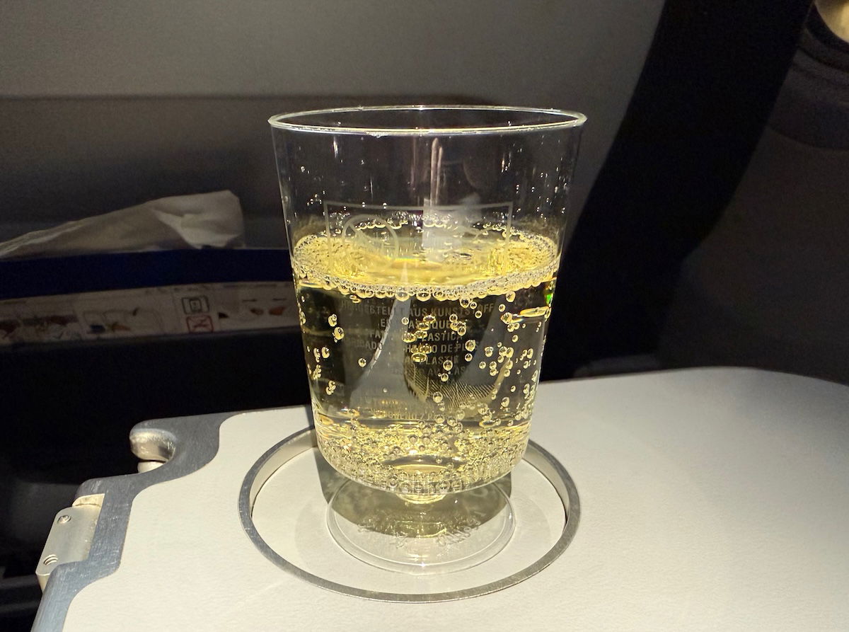 Toward the end of the boarding process, pre-departure drinks were offered, with the choice of sparkling wine or water. I chose the former, which was served in a plastic cup.