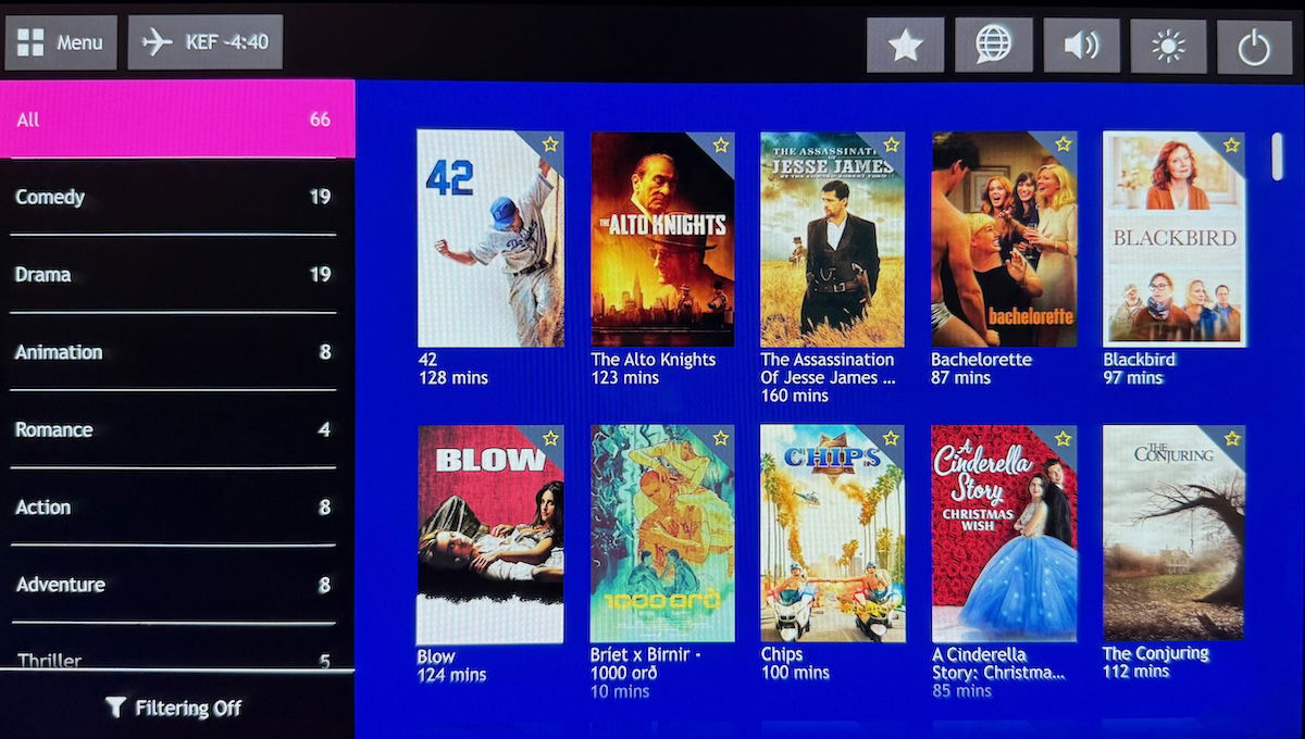 It was nice to have a seat back entertainment system, and I’d say the selection was solid, but not huge. For example, there were a total of 66 movies, while there were a total of 231 TV shows (though many were just very short clips about Iceland), and there were 534 music albums.