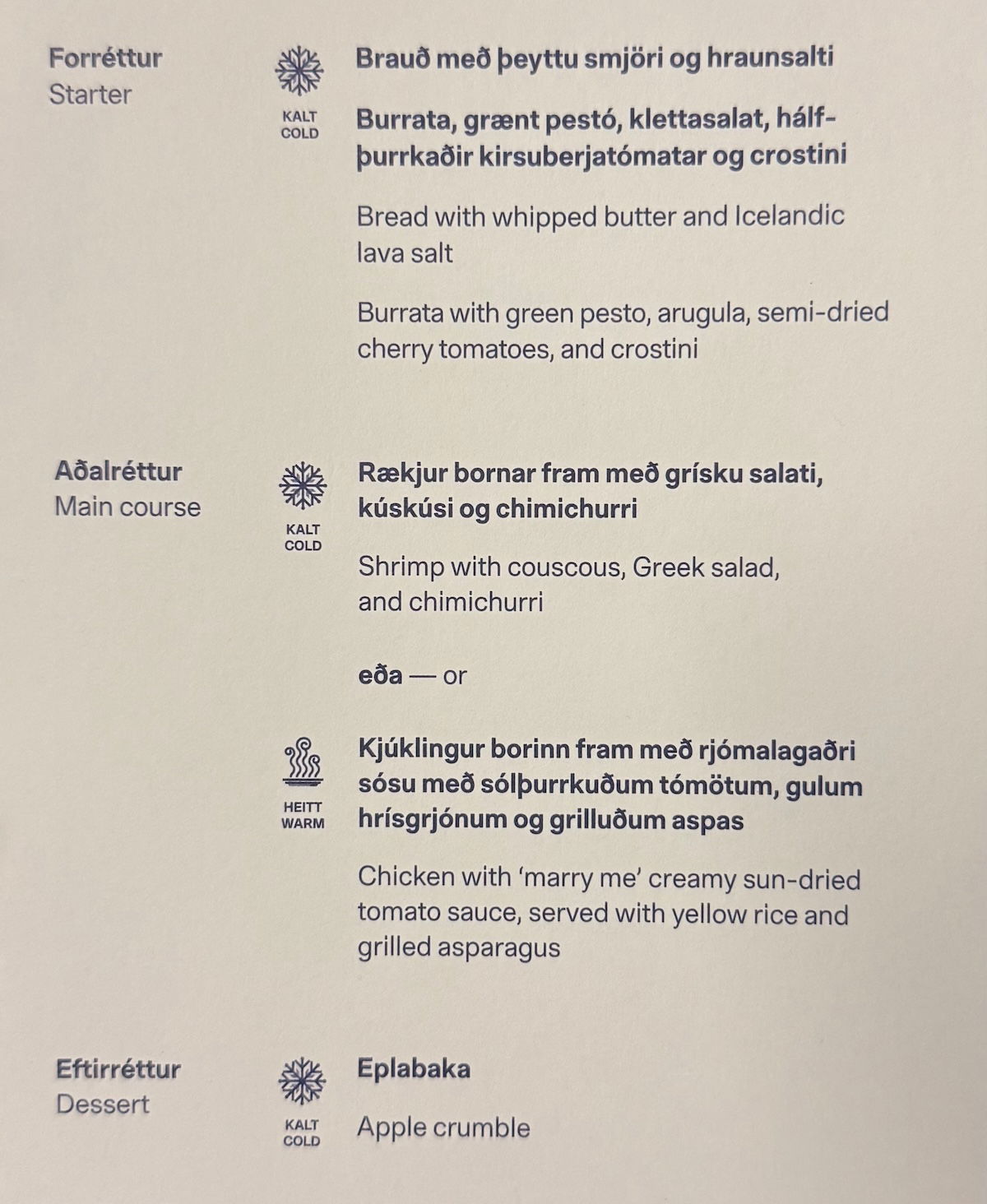 On this quick overnight flight, there was a meal service after takeoff, and that was the extent of the proactive service. You can find the dinner menu below — Icelandair serves a three-course meal on North America flights, and a two-course meal on Europe flights.