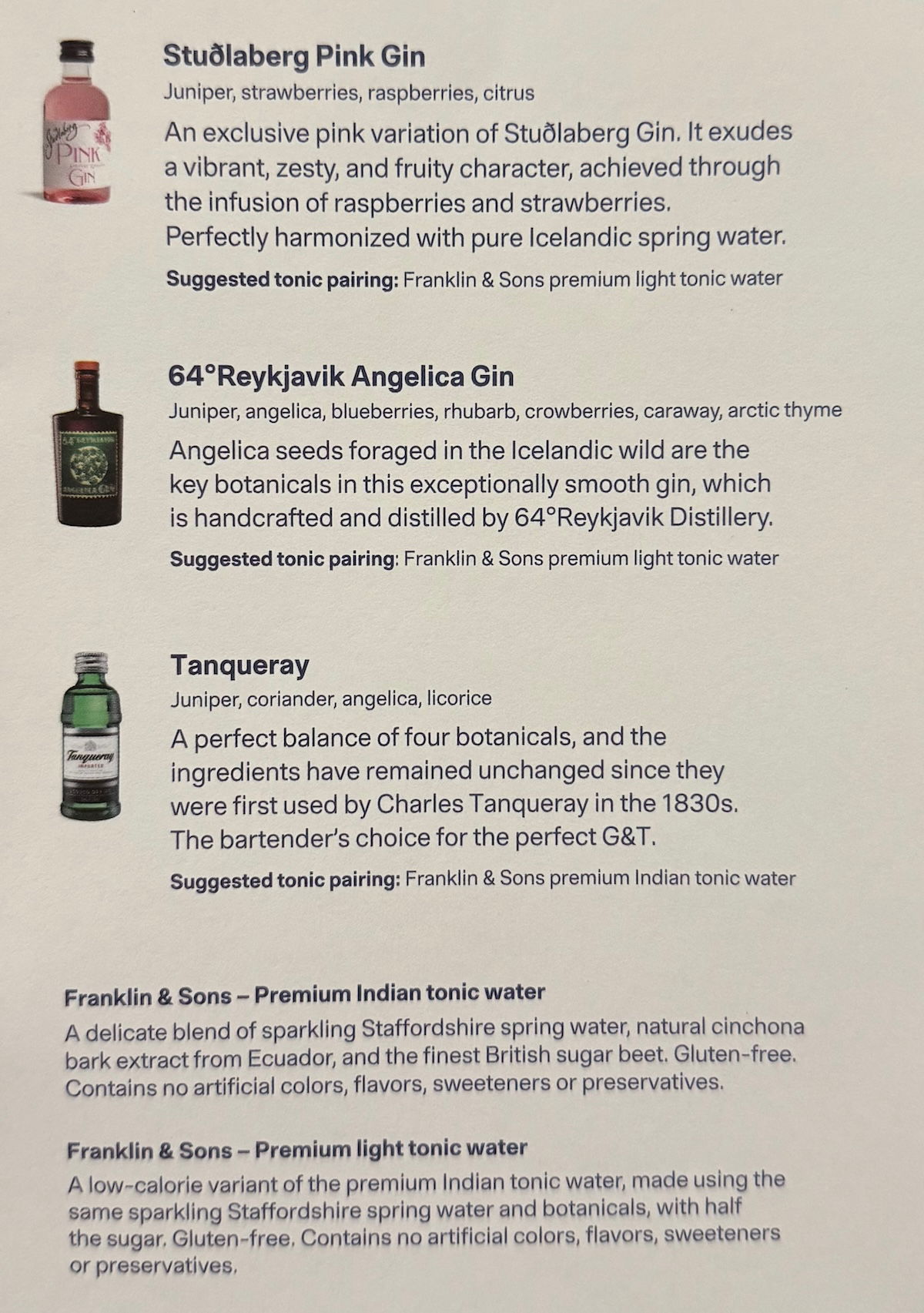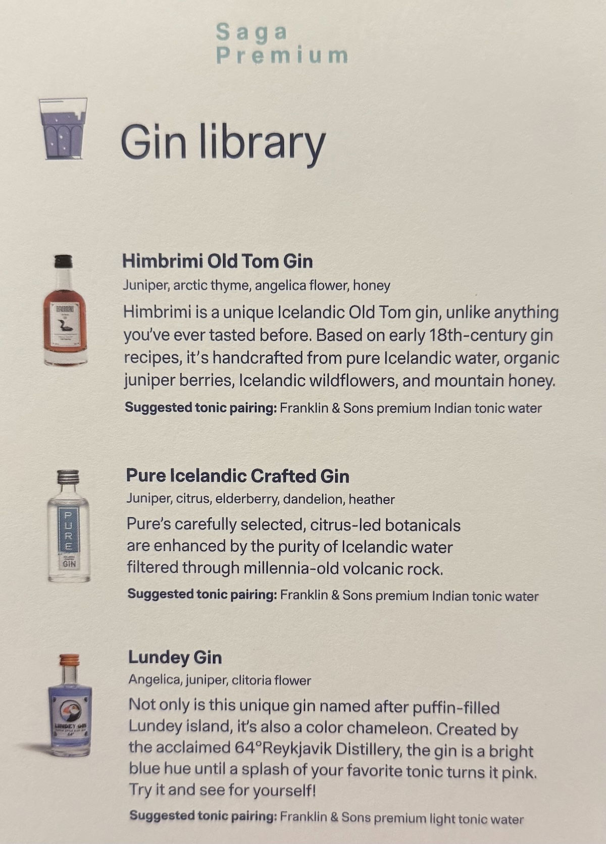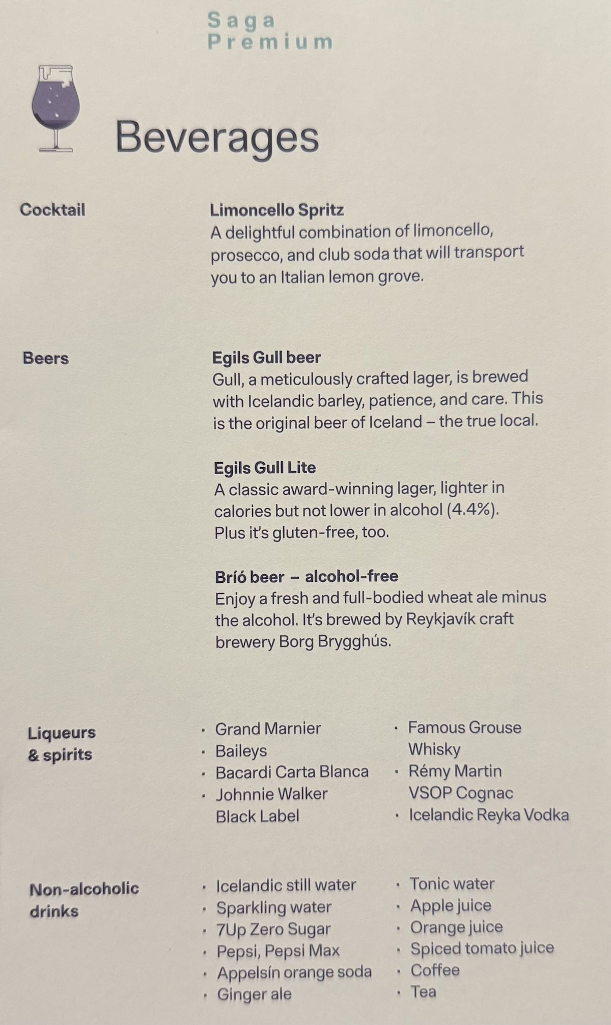 Icelandair prides itself in its drink selection, and in particular, in the variety of Icelandic gins served. So you can find the drink list below, including wine, beer, soft drinks, liquor, and in particular, the “gin library.”