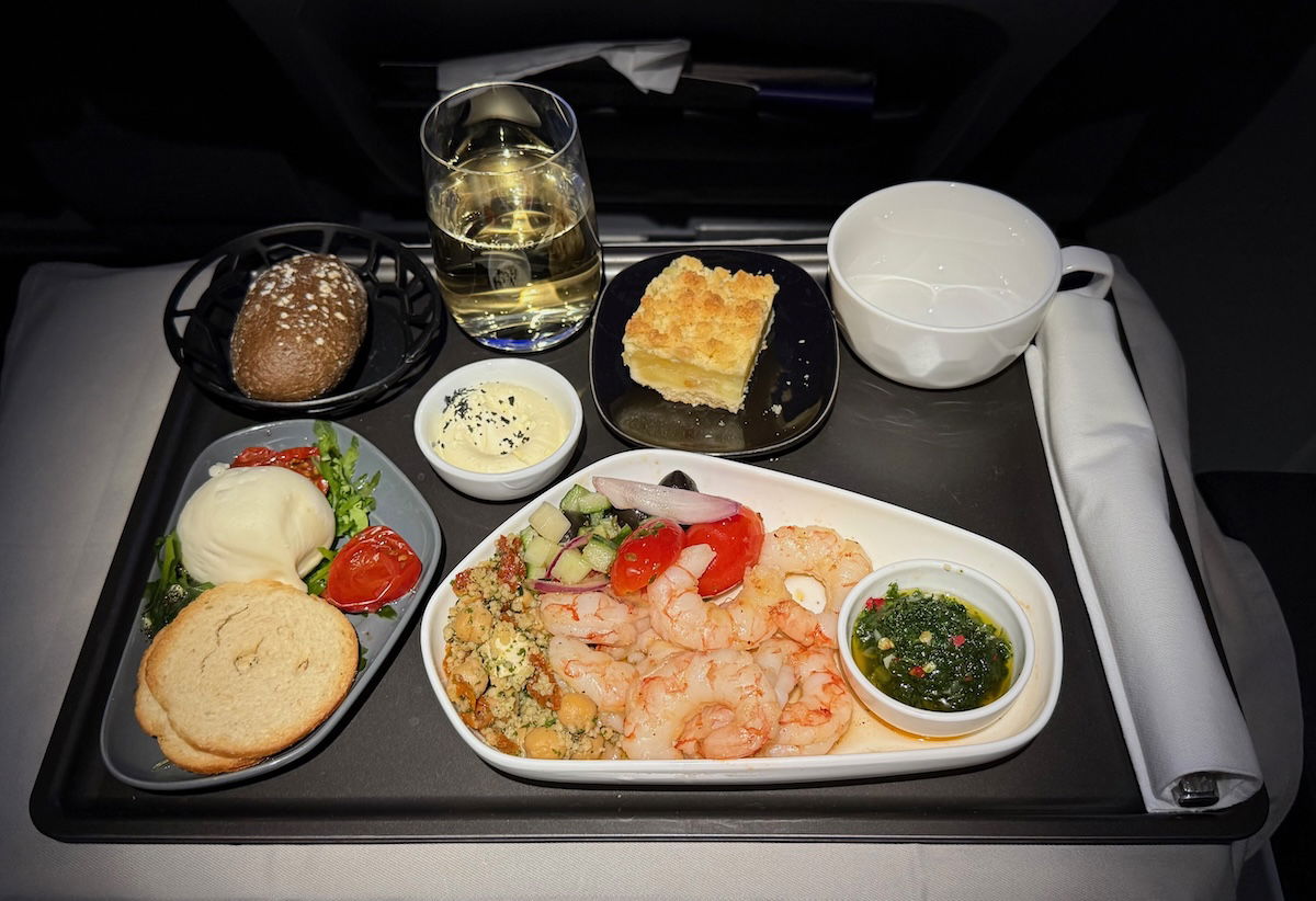Then just a little under an hour after takeoff, the meal was served, which included an appetizer, main course, and dessert, along with some bread.
