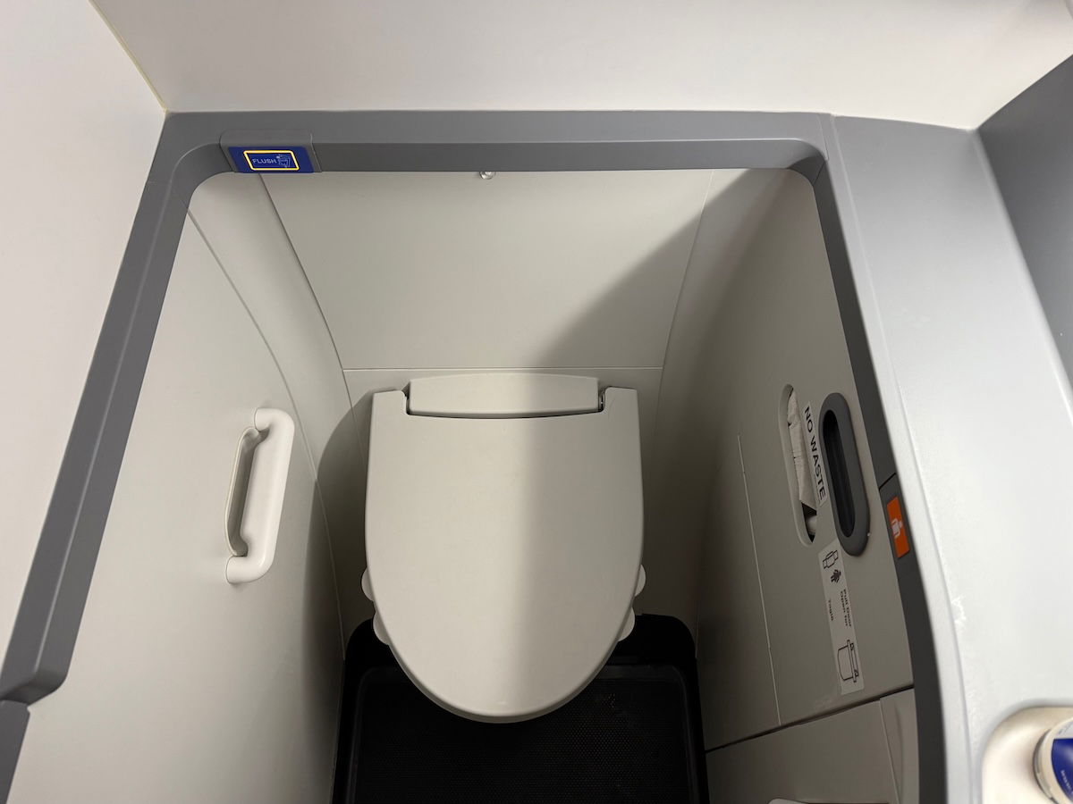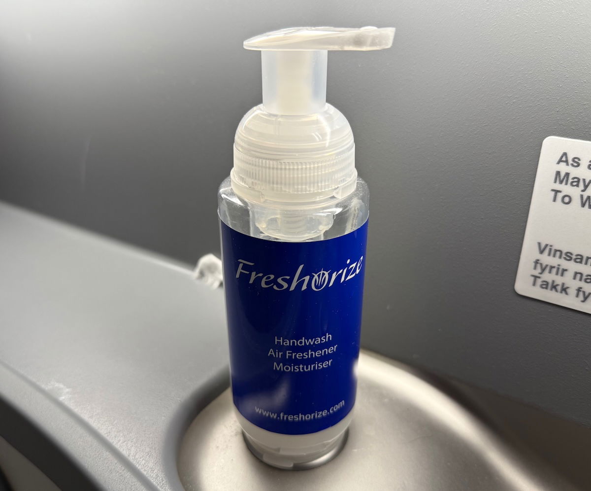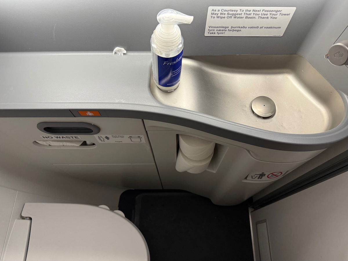 Icelandair’s 737 MAXs have a lavatory at the front of the cabin, reserved for Saga Class customers. I checked this out after the meal, and it was the typical very compact 737 MAX lavatory, with a tiny sink. I’m not a fan of these lavatories, but oh well, at least you don’t have to spend too much time in them (hopefully!).