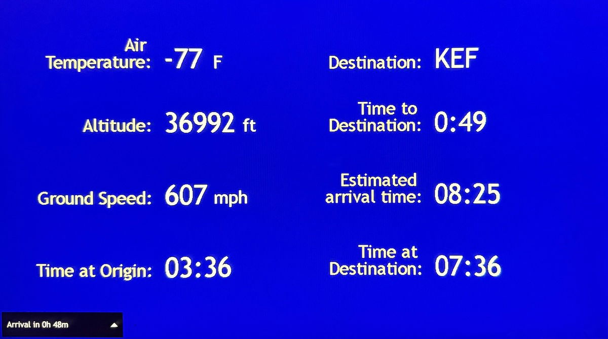 At around 7:55AM Keflavik time, the first officer was on the PA to announce that we’d be descending soon, and should be touching down around 8:30AM local time. Sure enough, we began our descent shortly thereafter, and the seatbelt sign was turned on at 8:05AM.