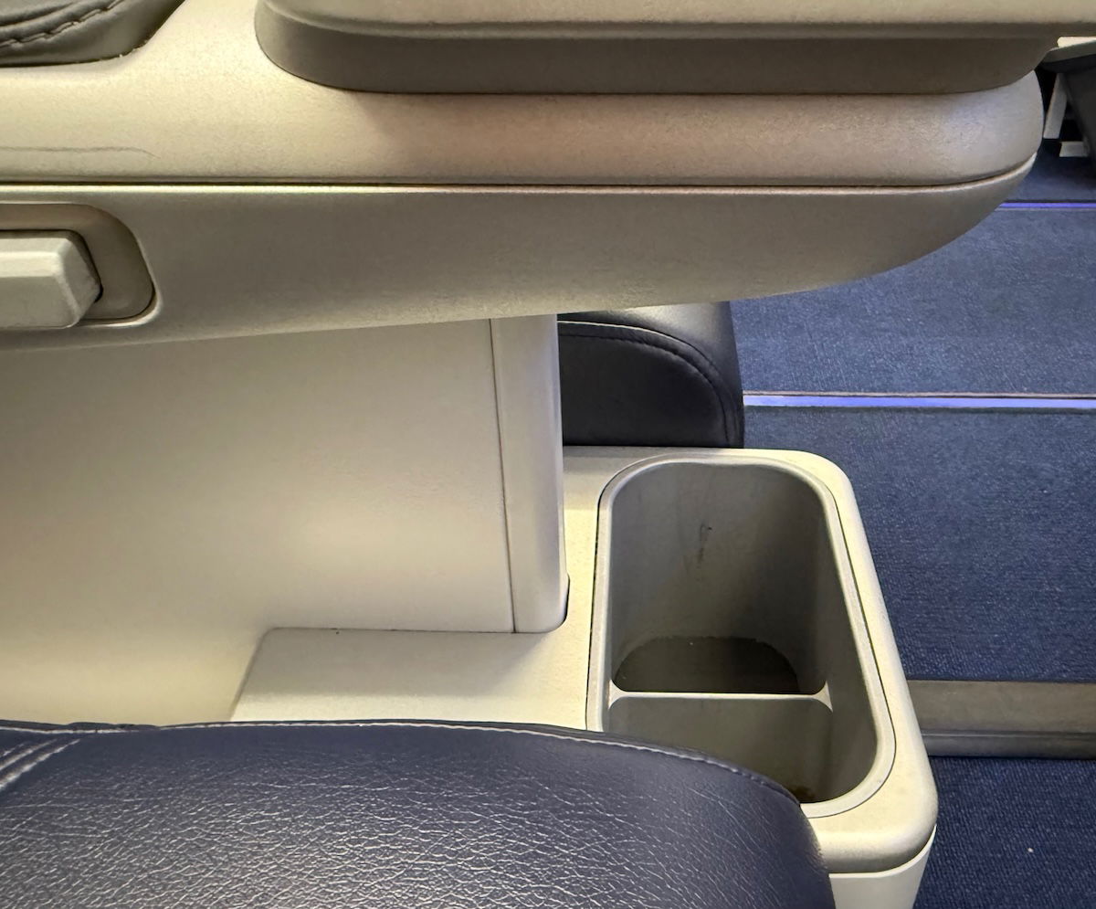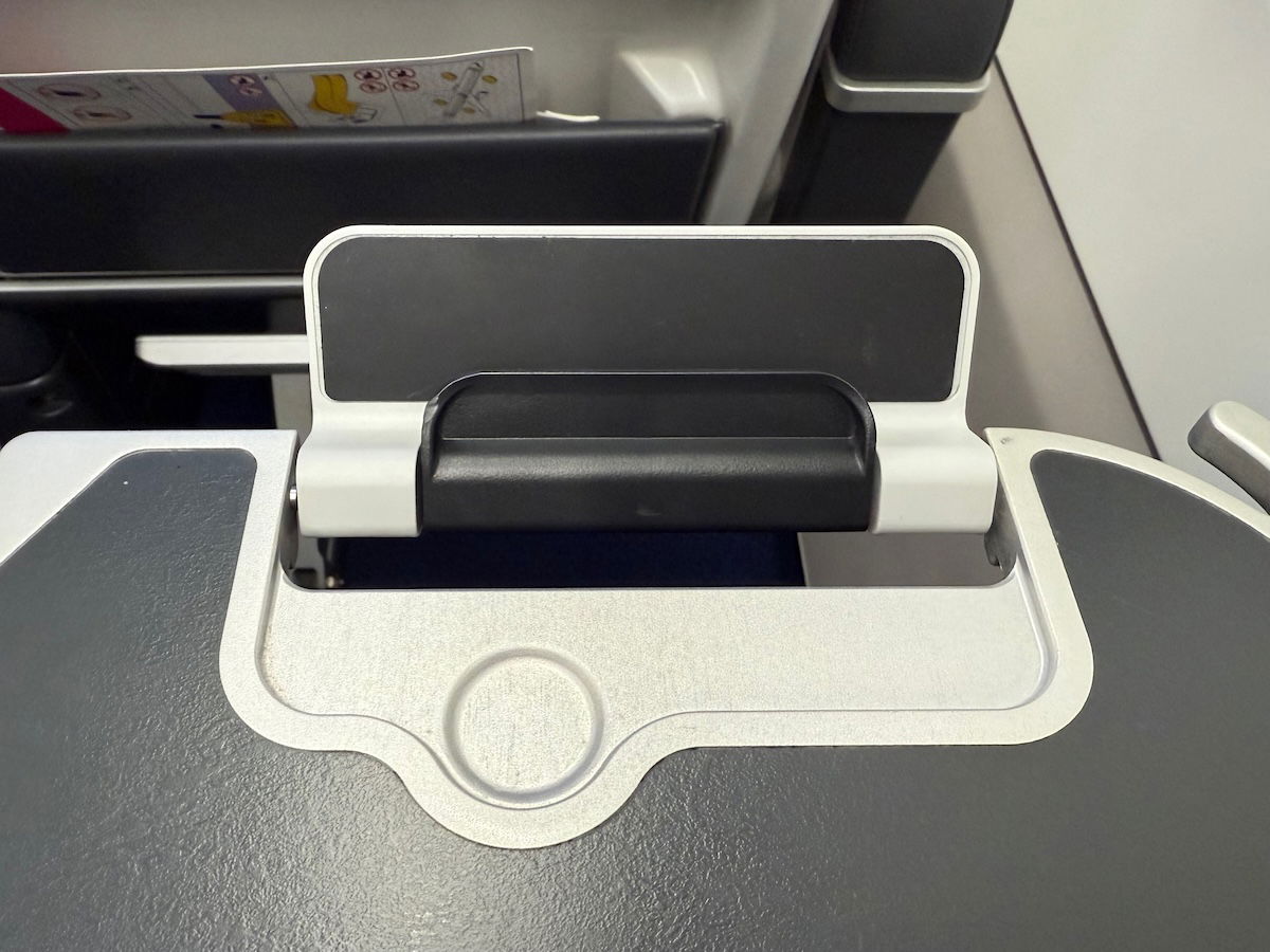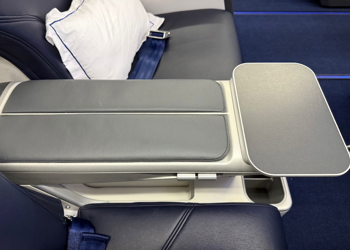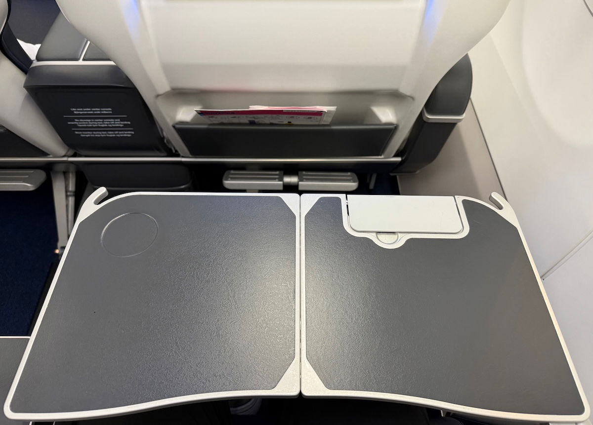 The tray table extends from the far armrest, and can be folded over in half. The tray has a personal device holder, should you want to watch entertainment on a tablet or smartphone.