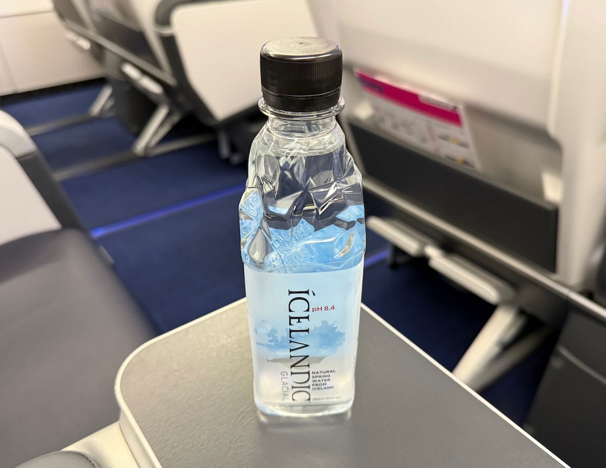 There weren’t any amenity kits, though passengers were offered a bottle of water (there were no pre-departure drinks), plus the same headphones you’ll find on all Icelandair Saga Class flights.