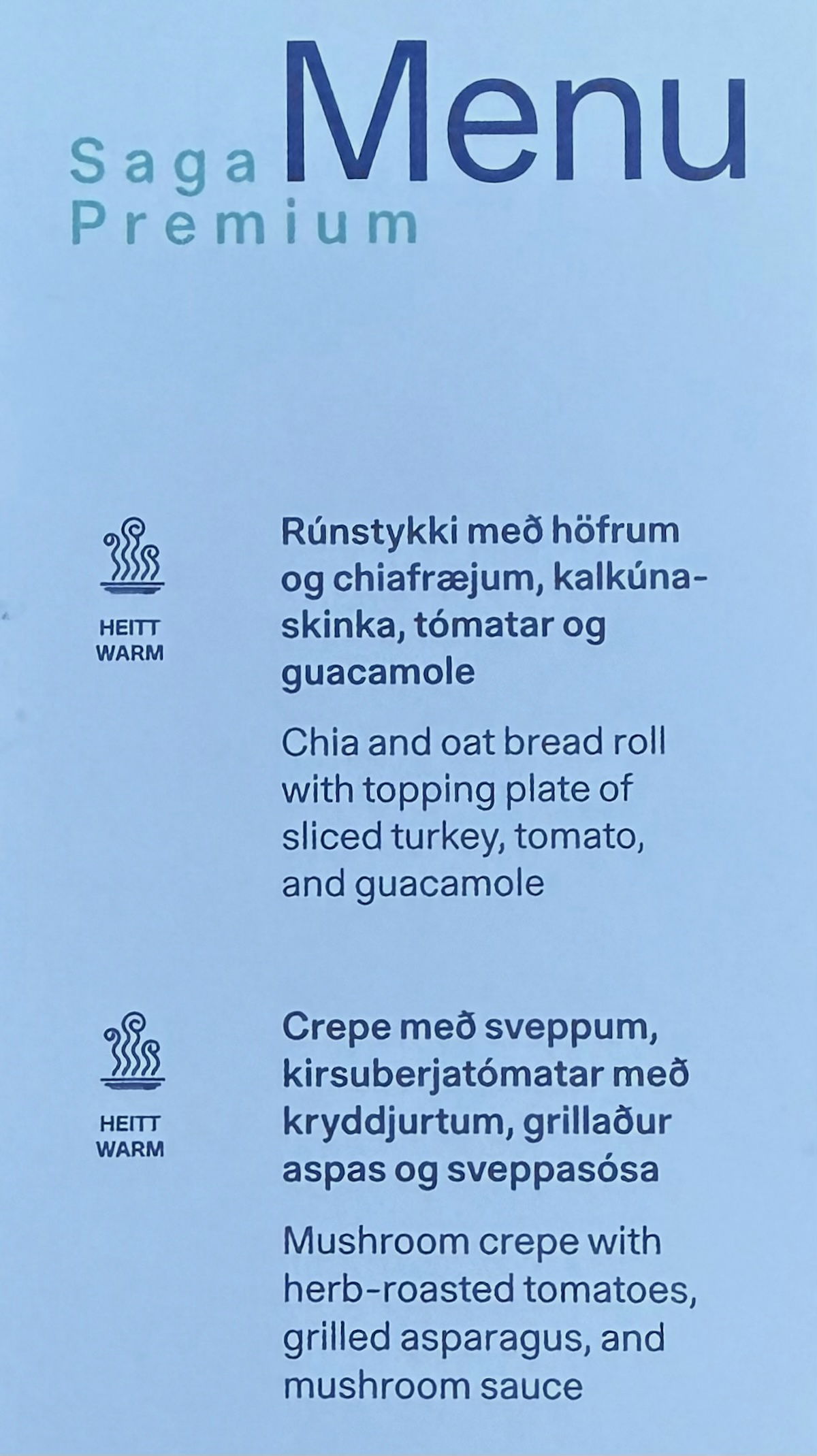 After the first round of drinks, the crew came through the cabin to take meal orders, with the options being described as scrambled eggs or a mushroom crepe. However, by the time they arrived at my seat, they didn’t have eggs anymore, so the only option was the crepe (it slipped my mind that Icelandair lets you pre-order meals).