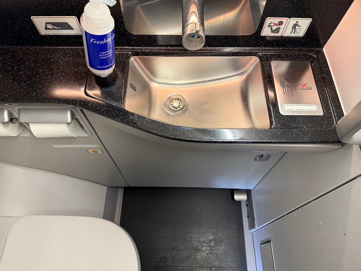 After the meal, I decided to check out the Saga Class lavatory, located at the front of the A321LR cabin. While definitely on the tight side, at least the forward A320-family lavatories are still more pleasant than the 737 MAX lavatories. There was nothing in the way of special amenities, though.
