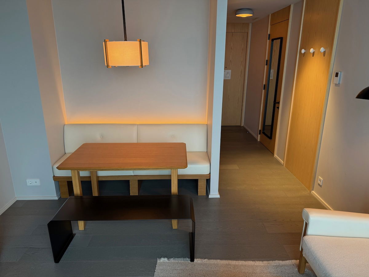 The living room was a fully separate room from the bedroom, and it had both a couch (or perhaps more of a loveseat) facing a wall-mounted TV, as well as a dining area with a banquette and a (really hard and heavy) bench.