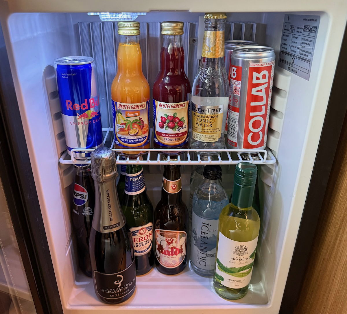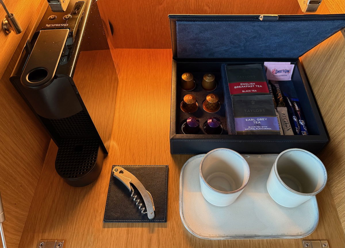 Underneath the TV was the minibar, which contained complimentary Nespresso coffee and Taylors tea, plus a variety of drinks and snacks for purchase.